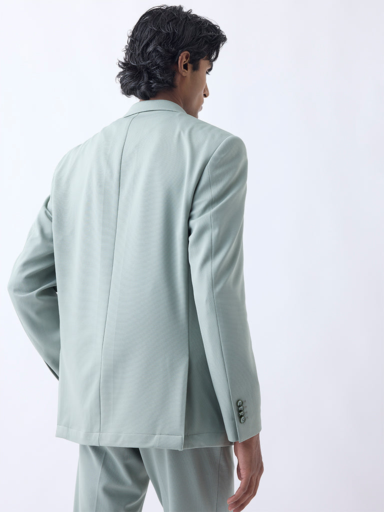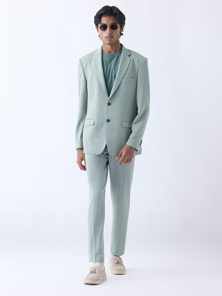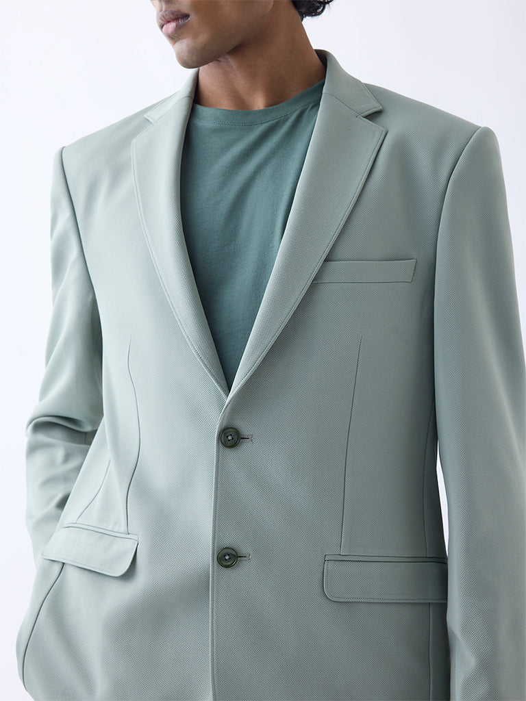 This sage blazer from WES Formals is tailored with a classic notched lapel collar and a structured button-up front. Designed with full sleeves and front welt pockets for added practicality. it blends form and function effortlessly. Crafted from breathable fabric. it ensures all-day comfort while keeping the silhouette sharp and refined.