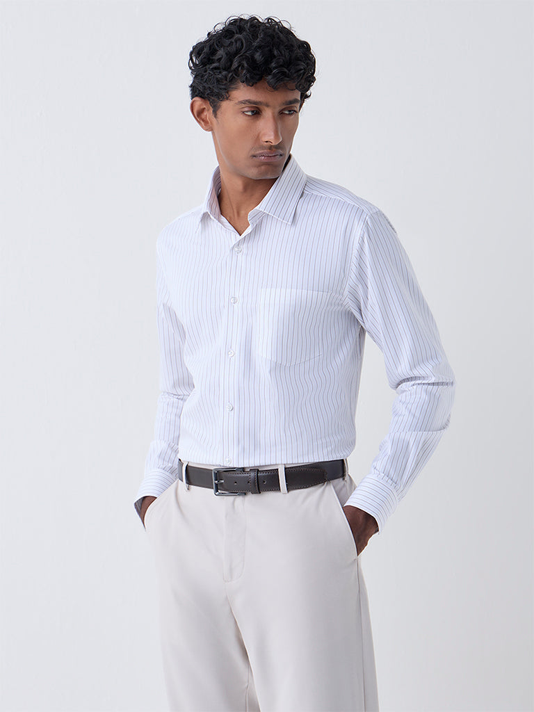 This taupe shirt by WES Formals is structured in a slim-fit silhouette for a sharp look. Featuring pinstripes for a classic appeal. it is crafted from cotton-rich fabric. ensuring utmost comfort. Designed with a spread collar. a button-up front and full sleeves. it is complimented by a chest pocket that adds a functional accent.