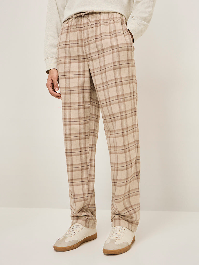 WES Lounge Beige Checks Print Mid-Rise Relaxed-Fit Cotton Pants