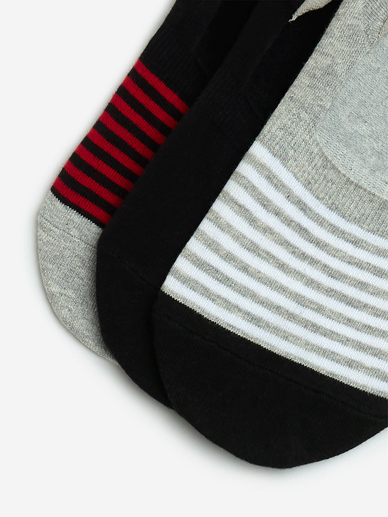 This set of three invisible socks from WES Lounge features two striped variants in black and grey. along with a classic solid design. Constructed from a premium cotton blend material. they provide a secure. no-show fit—ideal for effortless comfort with low-cut shoes.