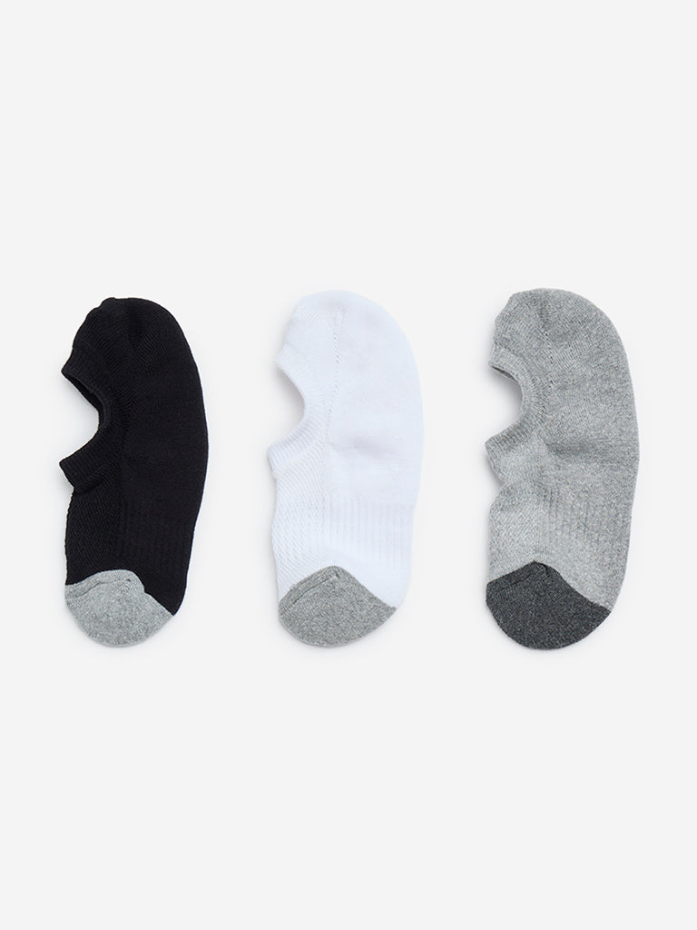 WES Lounge brings you this pack of three no-show socks in black. white. and grey variants. Each pair features a grey colour block design with a ribbed texture for a snug yet flexible fit. Crafted from a soft and stretchable fabric. they offer ample toe and heel space for enhanced comfort throughout the day.