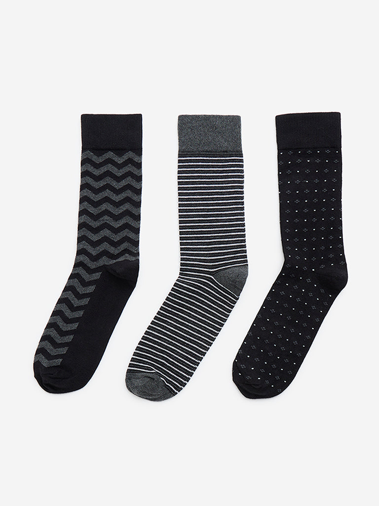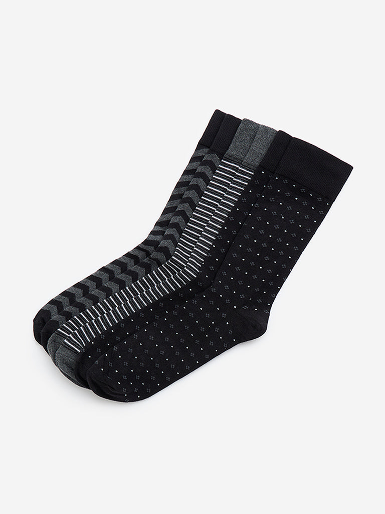 Available in striped. chevron. and dot-printed designs. these black full-length socks by WES Lounge combine style and comfort. Crafted from soft. stretchable fabric. they ensure a snug fit for all-day ease.