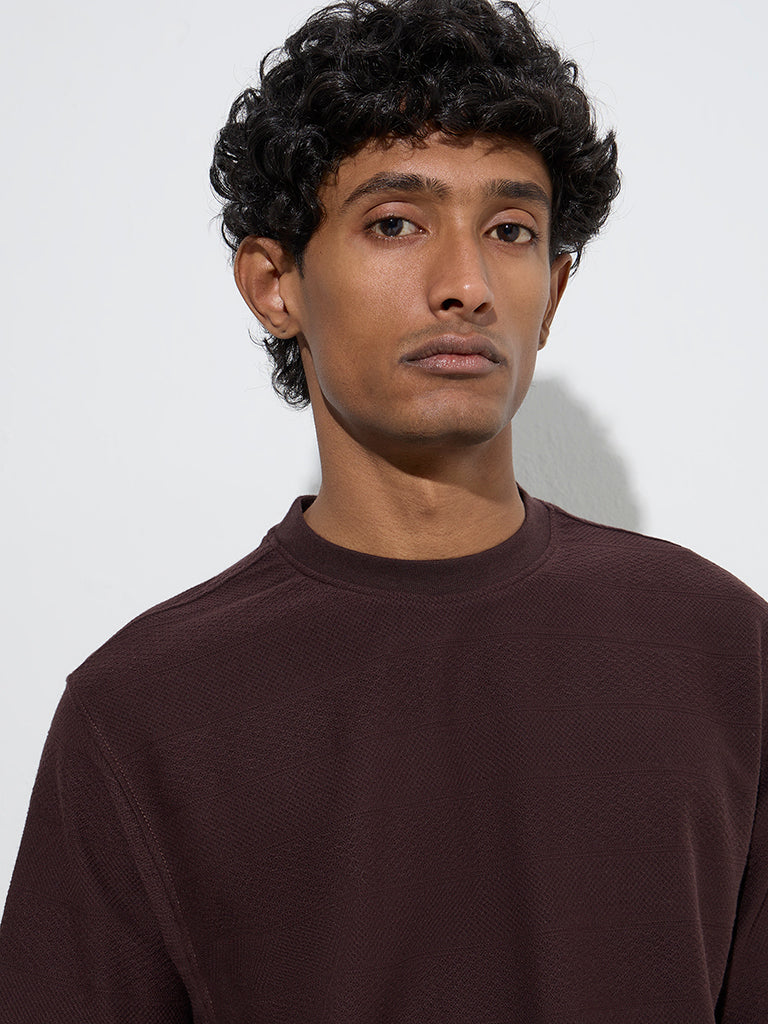 This brown t-shirt from WES Lounge is carved in a relaxed profile. enhanced by its subtle self-textured finish. Spun from a cotton-blend fabric. it features a classic round neck and half sleeves. offering effortless comfort with a touch of texture.