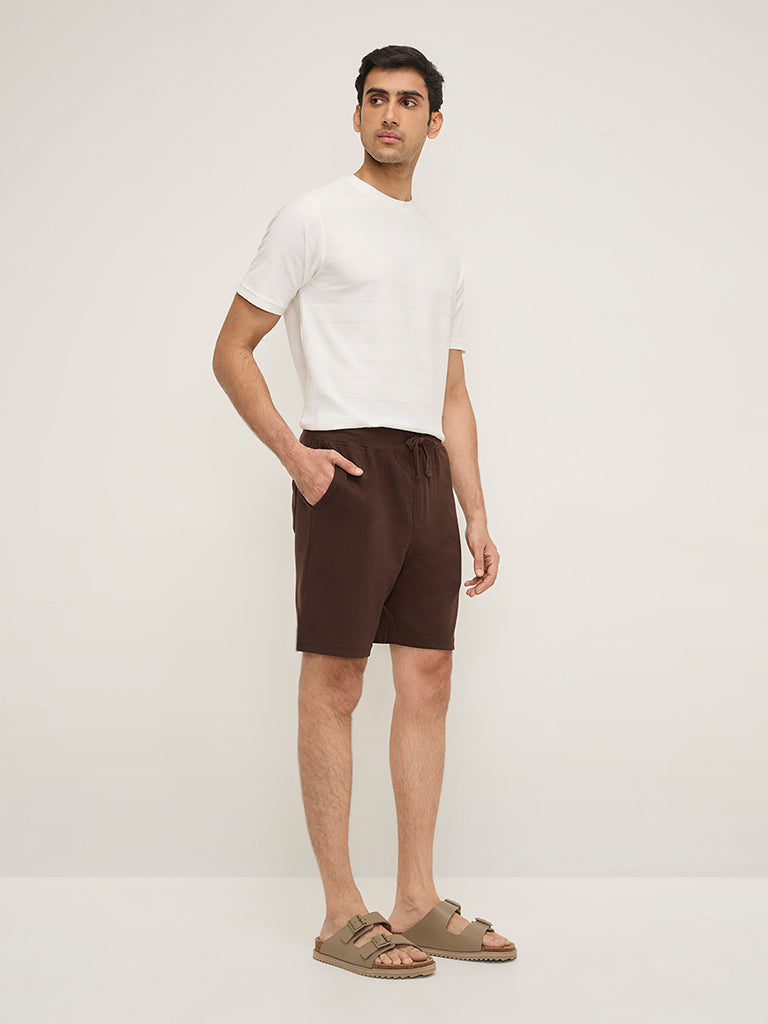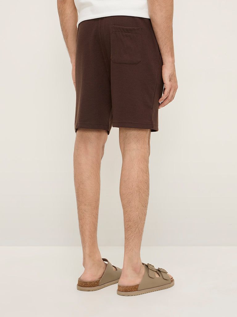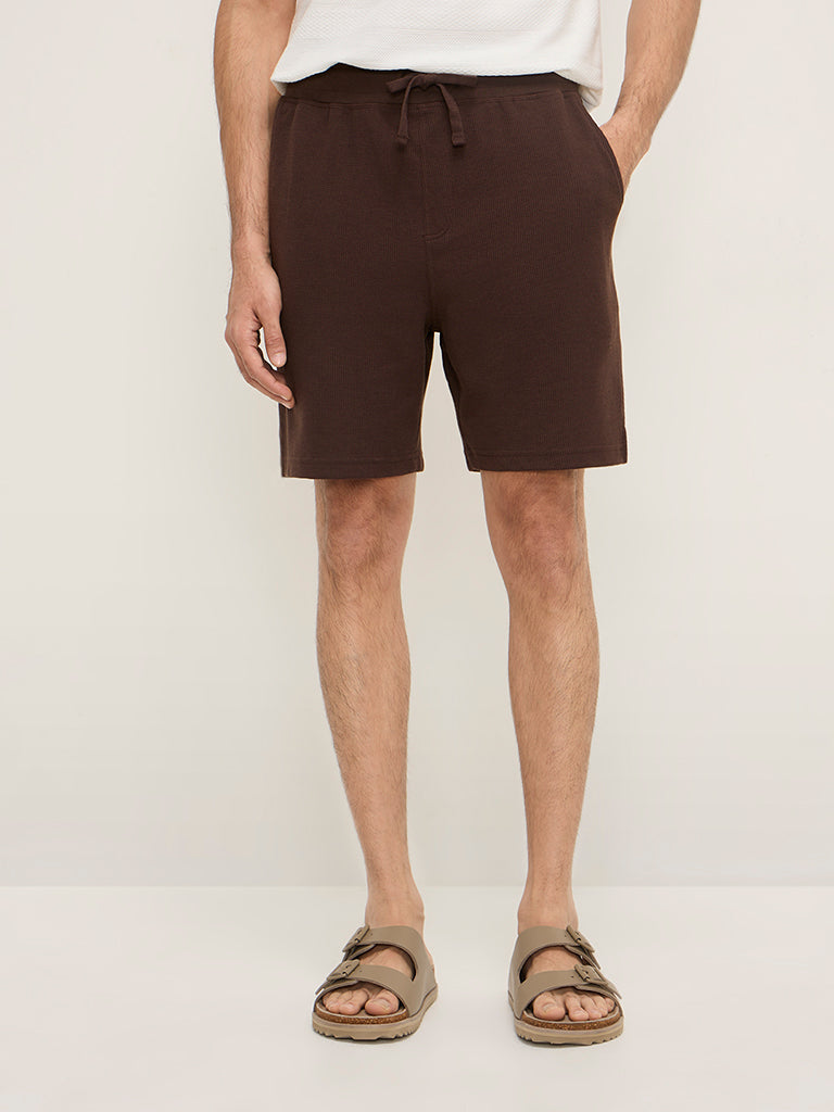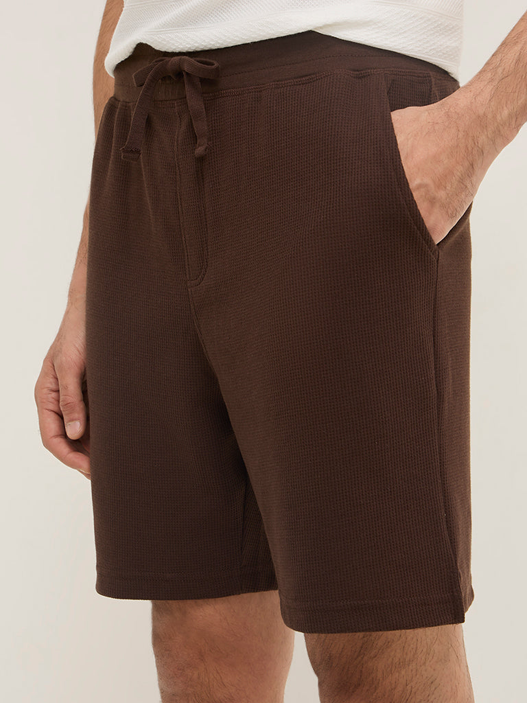 These brown shorts by WES Lounge are crafted with a waffle texture. Offering a quality fabric experience. the mid-rise bottom wear carries a smooth elastic waistband. adjustable drawstrings. and side pockets.