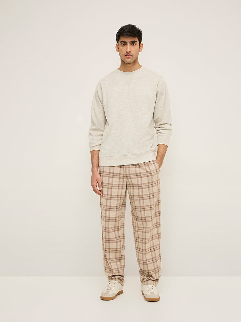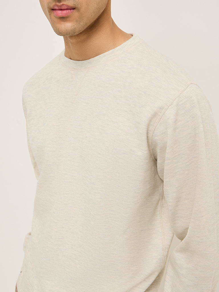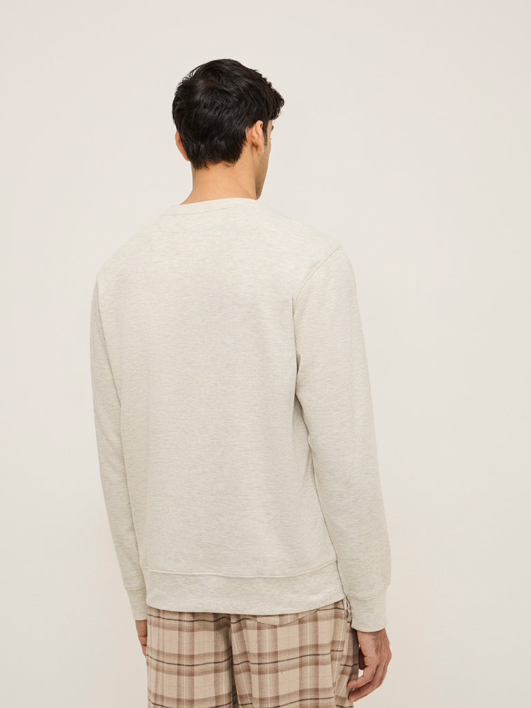 This grey t-shirt by WES Lounge features textured detailing. Crafted from a cotton-rich blend. the relaxed-fit garment boasts a round neck and full sleeves.