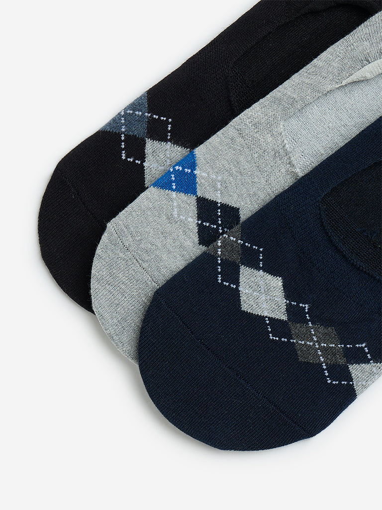 WES Lounge introduces this pack of three multicolour invisible socks. available in shades of navy. grey melange and black. each showcasing argyle patterns for added charm. These socks are equipped with a silicon grip for comfort and ease of wear.