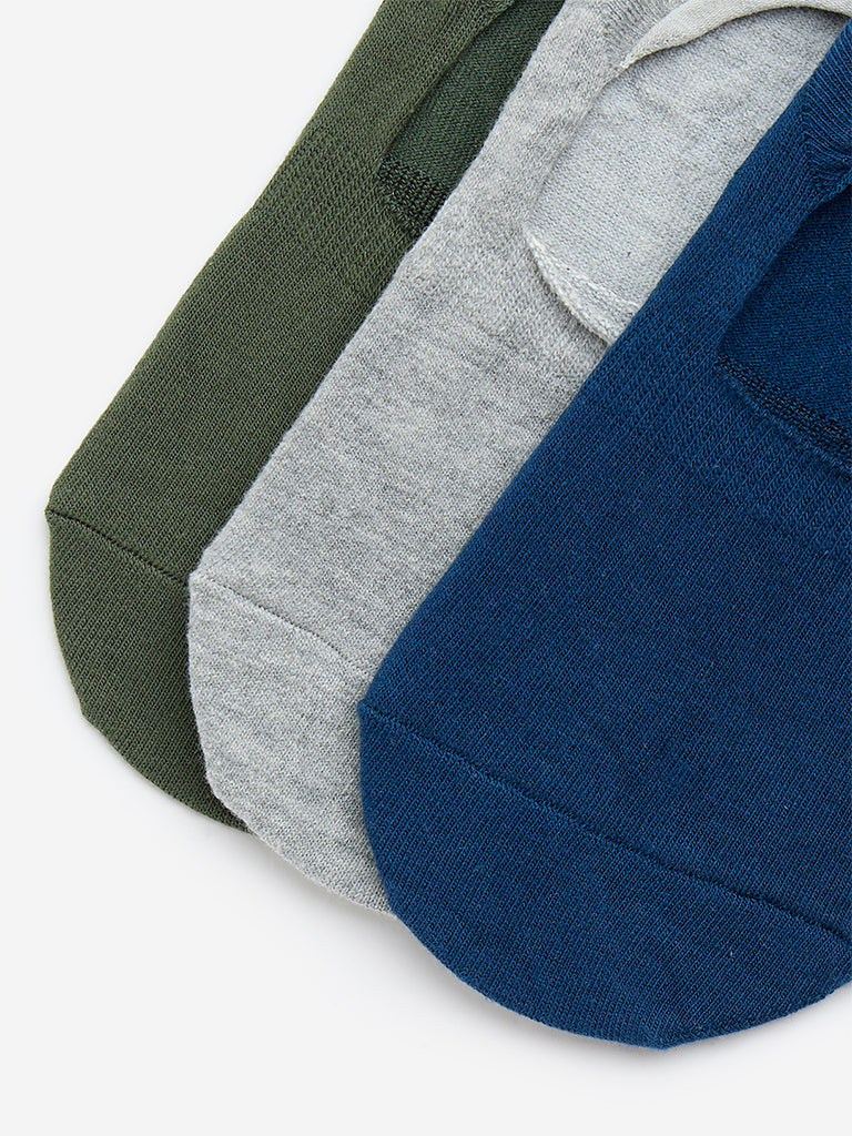 This pack of three no-show socks by WES Lounge include green. grey. multicolour and blue variants with a mix of solid and striped designs. Crafted from soft. stretchable fabric. they ensure a snug and comfortable fit for all-day wear.