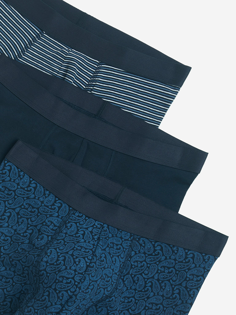 This navy-themed set of three trunks from WES Lounge brings together paisley prints. classic stripes. and solid styles for a versatile innerwear update. Spun from pure cotton with a hint of stretch. each pair is designed to offer a breathable fit that moves with you. The elasticated waistband ensures a secure yet gentle hold. making them a comfortable choice for everyday wear with a dash of style.
