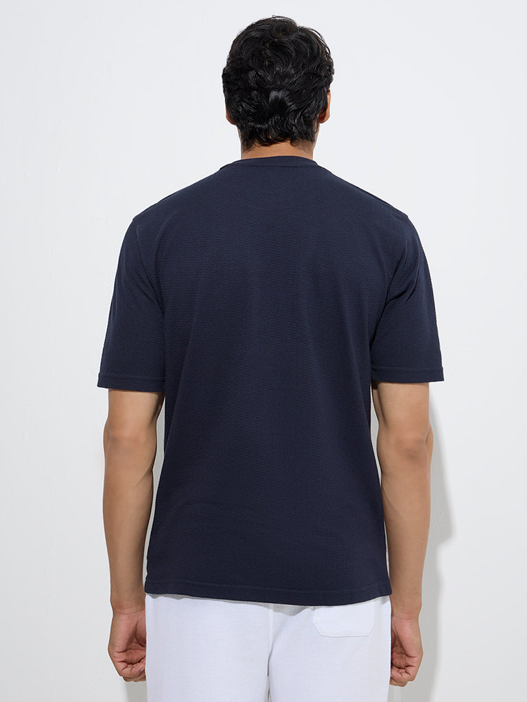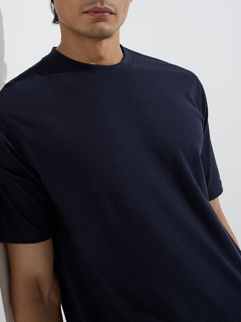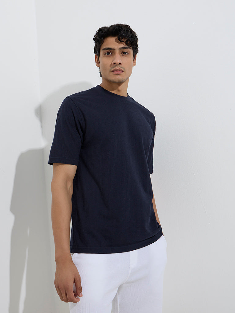 This solid navy t-shirt from WES Lounge is milled from a premium cotton-blend fabric for all-day comfort. Designed with a classic crew neck and half sleeves. it’s a versatile staple ideal for laid-back looks.