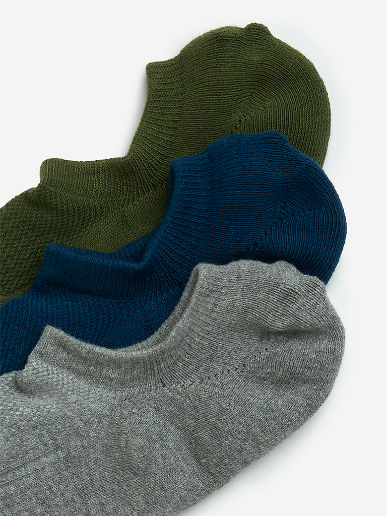 WES Lounge introduces this pack of three solid no-show socks in blue. olive. and grey. Spun from a premium fabric for enhanced breathability. they offer a seamless. stay-put design that remains hidden under your shoes—ensuring all-day comfort with a discreet finish.