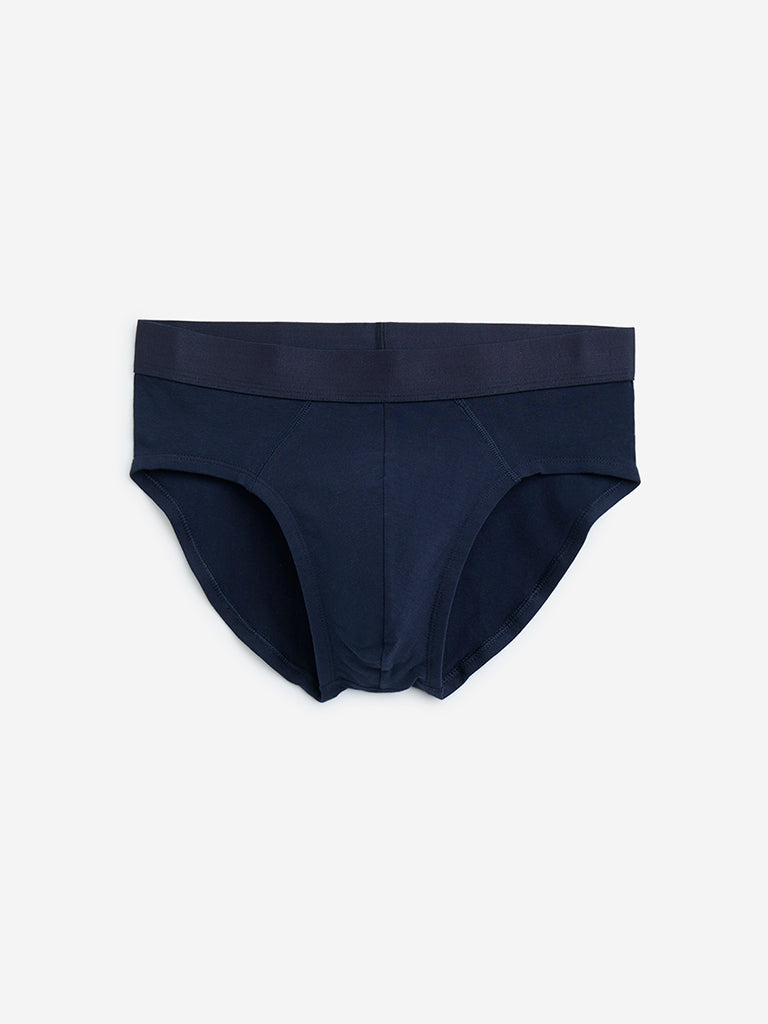 This pack of three briefs from WES Lounge includes solid taupe. navy blue. and teal options. Made from pure cotton. each pair features a smooth elastic waistband. mid-rise fit. and added space at the crotch for enhanced comfort and support.