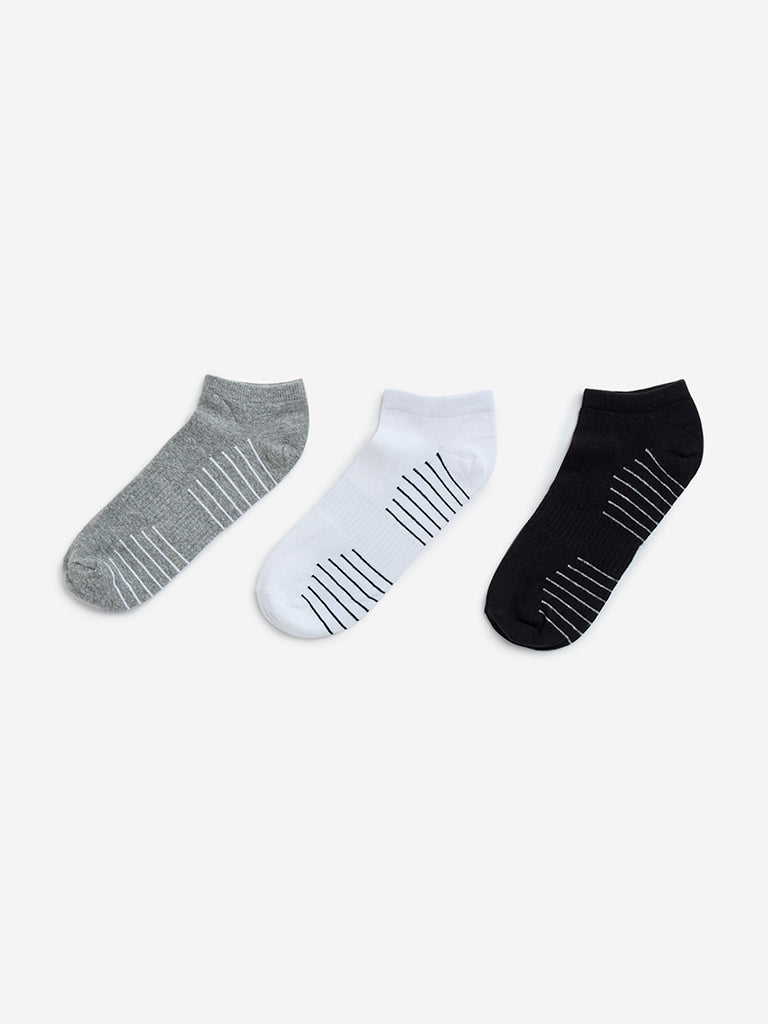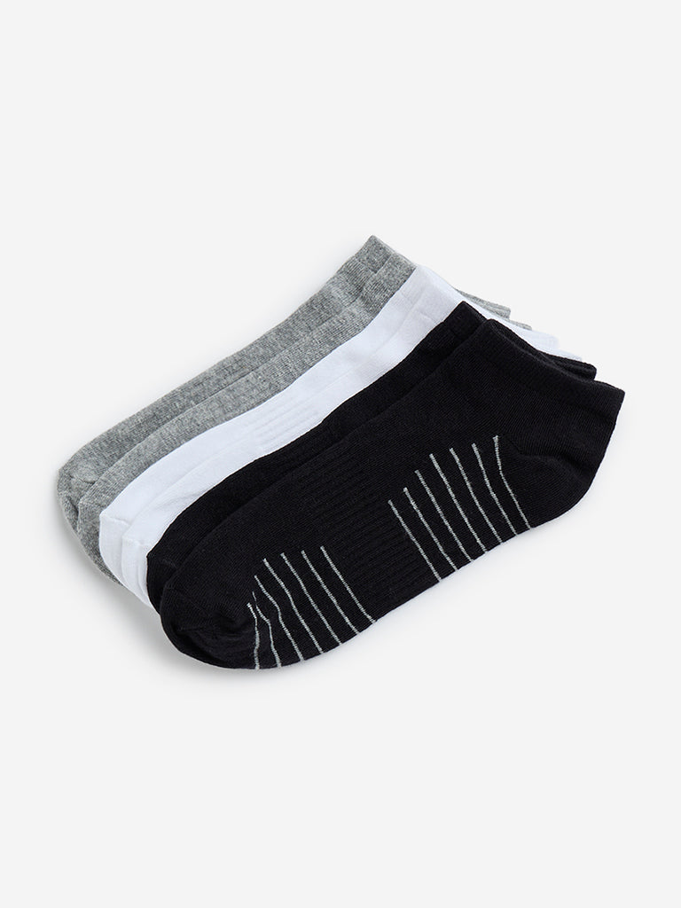 WES Lounge introduces this set of socks including three pairs in hues of black. white and grey. Crafted in a low-cut style from a stretchable cotton fabric. these provide all-day comfort and features stripes.