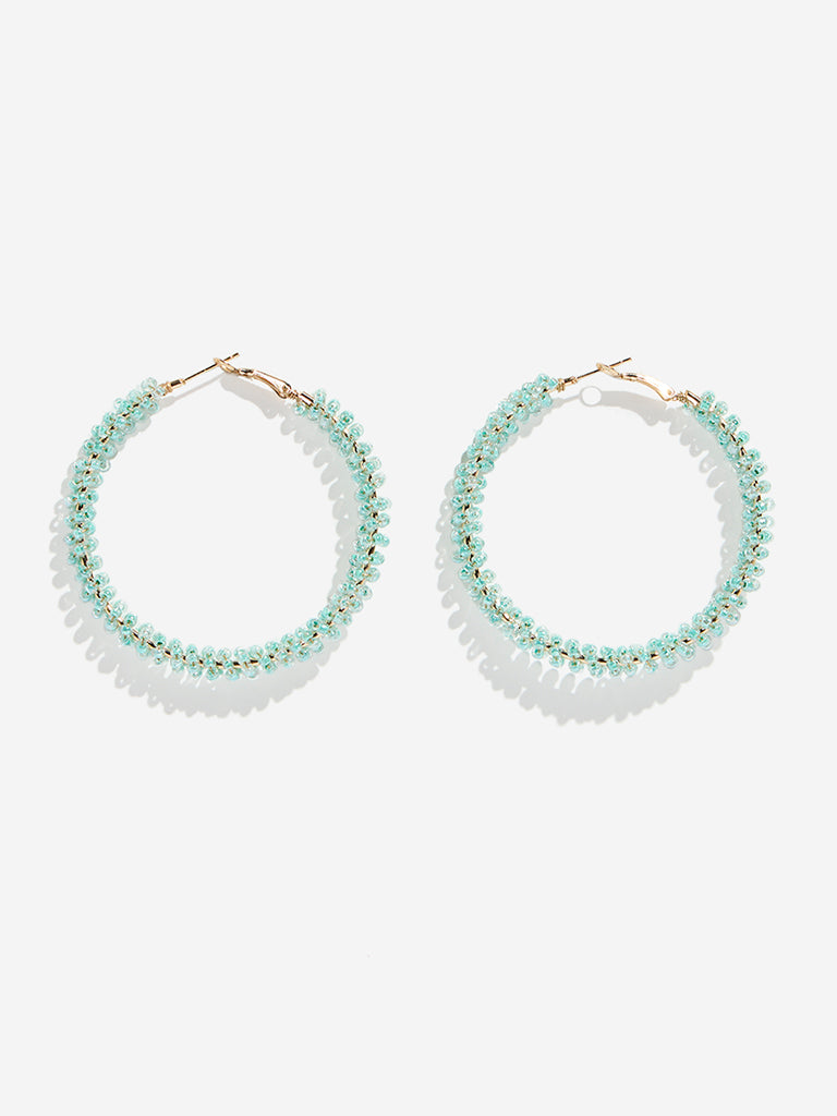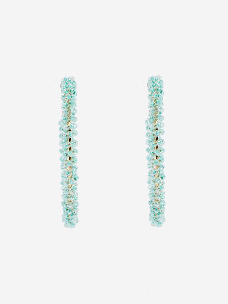 This pair of hoop earrings from Westside Accessories is are adorned with delicate aqua-toned textured beads that shimmer with movement. Featuring a latch-back fastening for a secure fit. their lightweight construction ensures a comfortable wear. making them perfect for both everyday wear and elevated occasions.