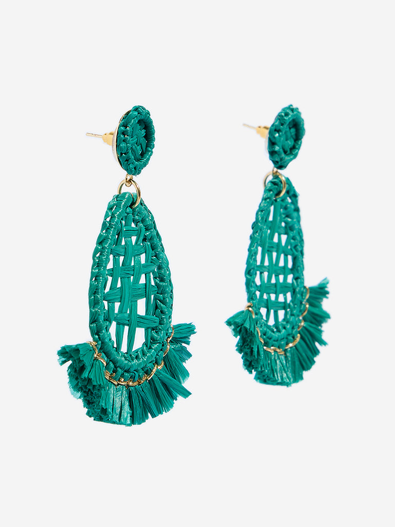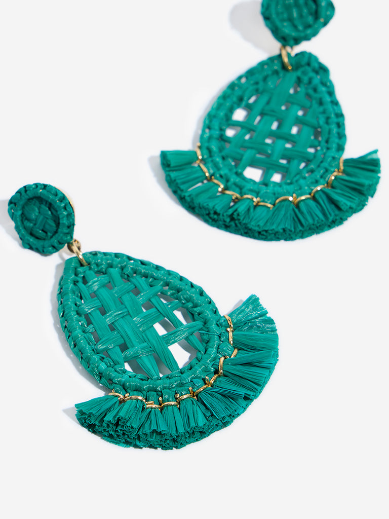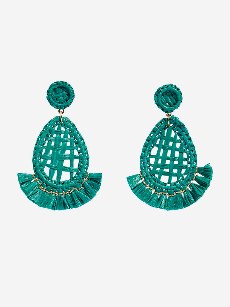 Westside Accessories brings a touch of tropical flair with these vibrant aqua earrings featuring a woven raffia design. with a teardrop silhouette anchored by a circular stud. Gold-tone edging adds a hint of shine. while playful frills at the base lend movement and texture. Finished with post-back closures. these earrings offer a fun. lightweight accent to elevate any basic ensemble.