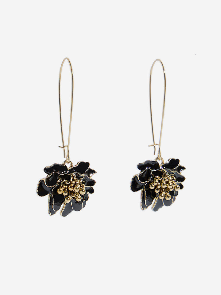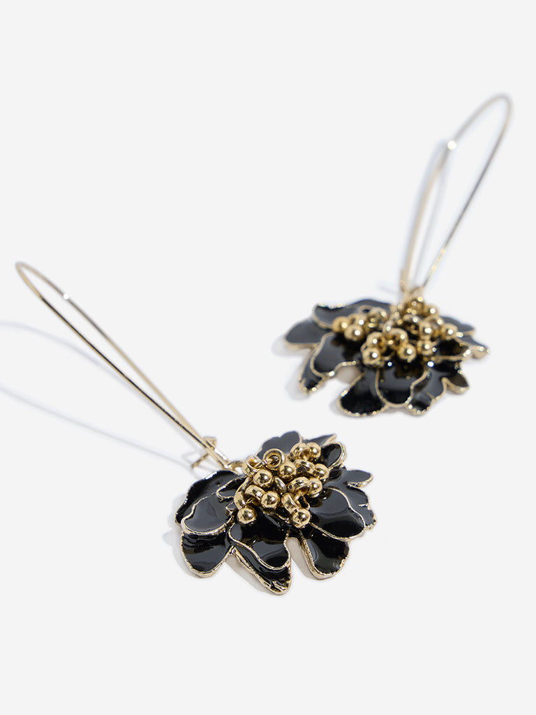 Westside Accessories presents these floral fish hook earrings. designed with multi-layered petals in a deep black hue for a refined floral look. A cluster of tiny silver-toned beads sits at the centre. adding subtle contrast and shimmer. Suspended from polished fish hook wires. these earrings ensure a secure and comfortable fit while offering lightweight elegance??perfect for both casual and dressy occasions.