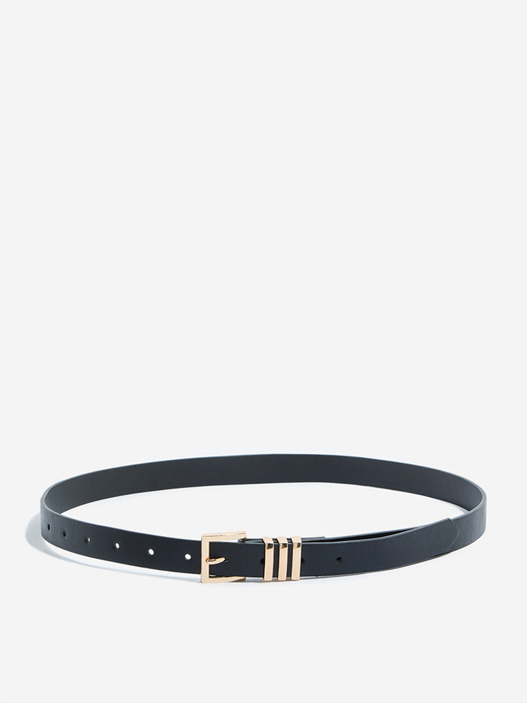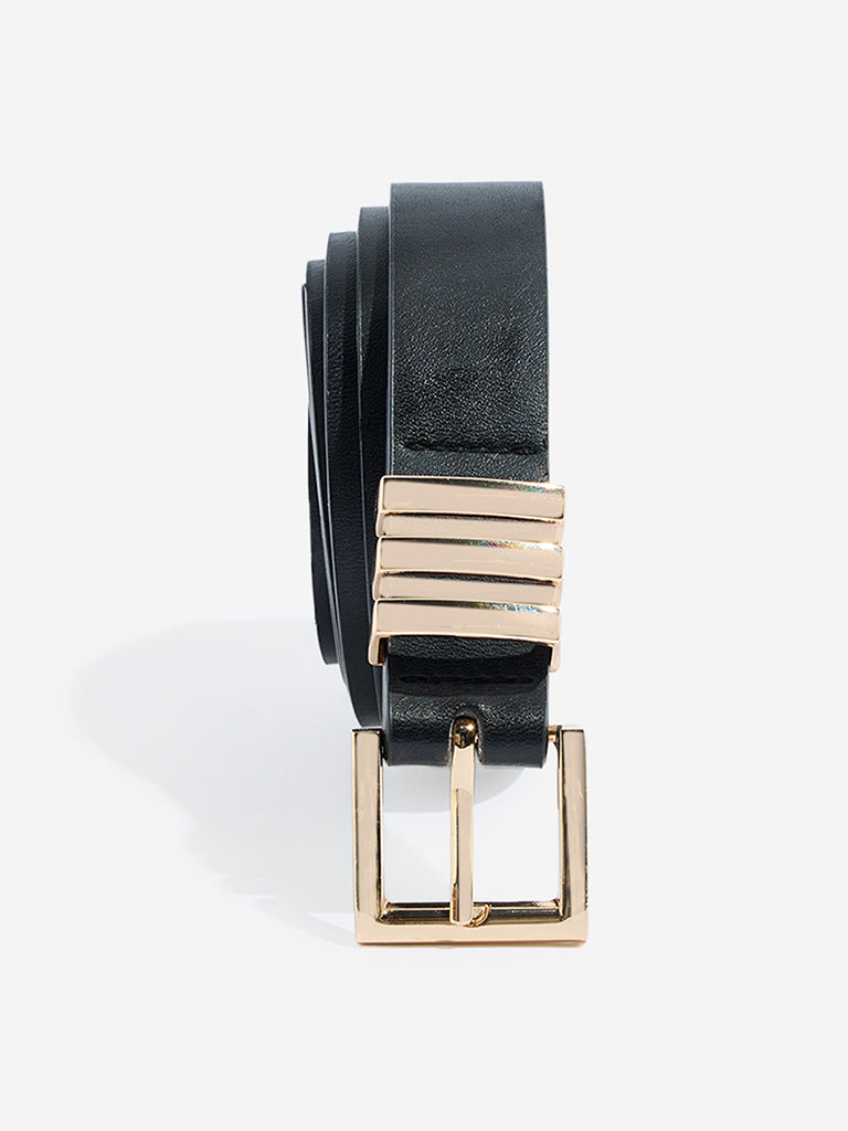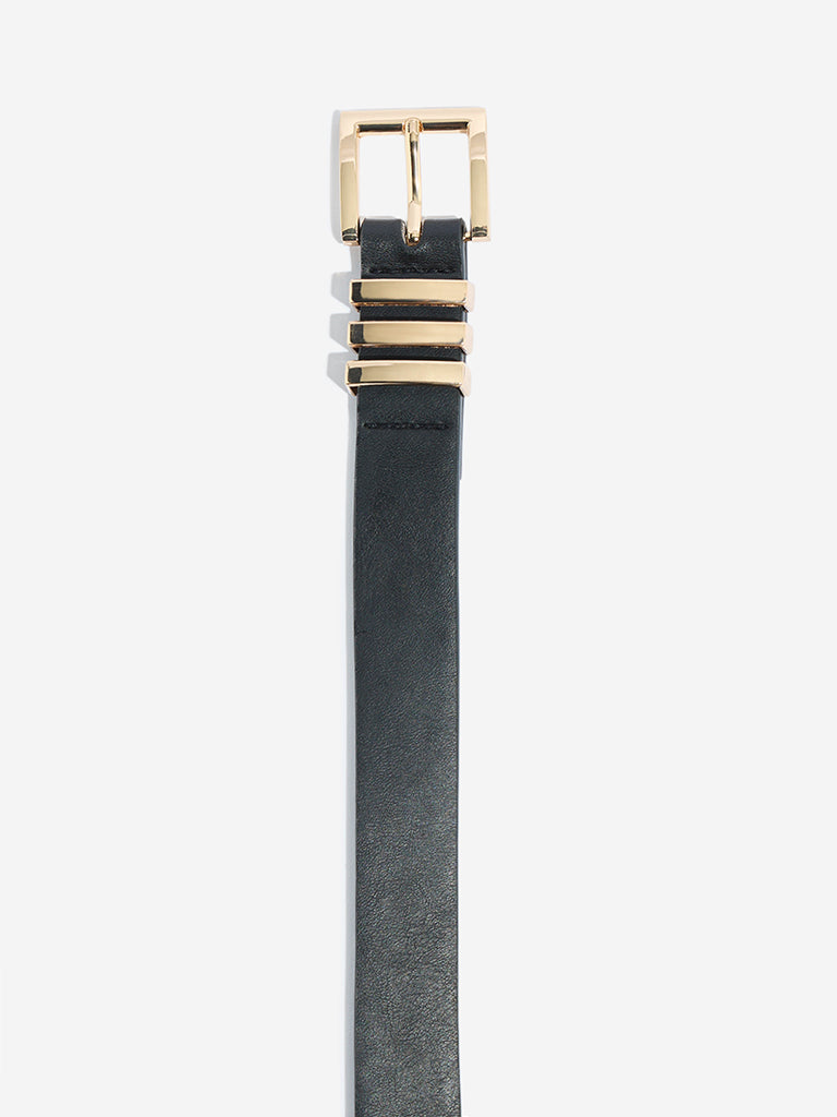 Westside Accessories presents this black belt. crafted from durable material for everyday sophistication. The gold-tone triple-loop hardware and rectangular buckle add a modern touch to its minimalist silhouette. Adjustable for a custom fit. it effortlessly elevates jeans. trousers. or dresses with a hint of edge. Whether styled high on the waist or low on the hips. it brings structure and subtle shine to every look.