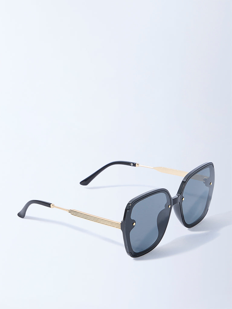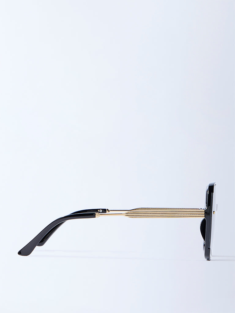 Bring a bold edge to your eyewear collection with these black oversized sunglasses from Westside Accessories. Designed with a sleek geometric frame. they feature dainty studs on the front for a touch of statement style. complemented by striped gold-tone temples. The dark-tinted lenses offer UV protection while keeping your look polished. Presented in a transparent pouch. they’re easy to carry and store. ensuring your sunglasses stay protected on the go.