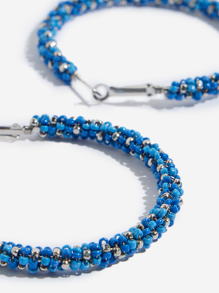 Westside Accessories presents these beaded hoops. featuring a striking mix of blue and lime beads. The playful design adds a pop of color. while the secure closure ensures a comfortable fit.