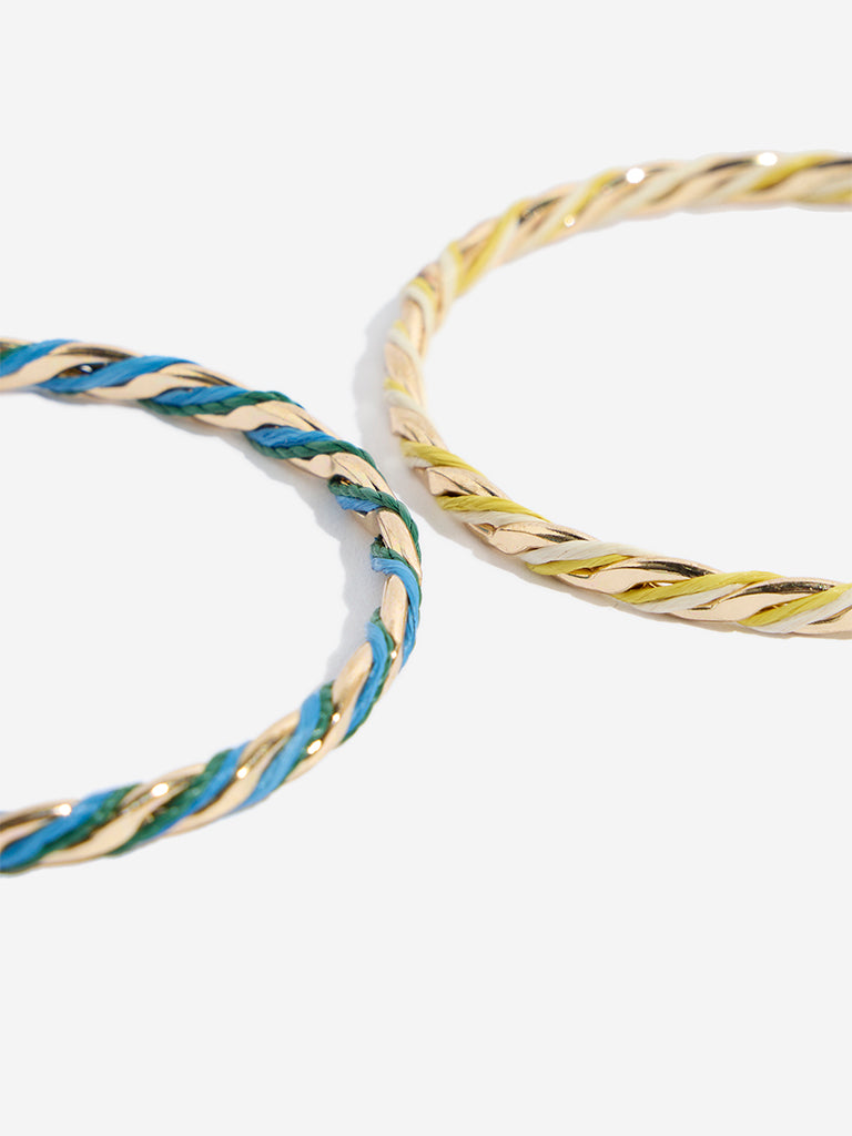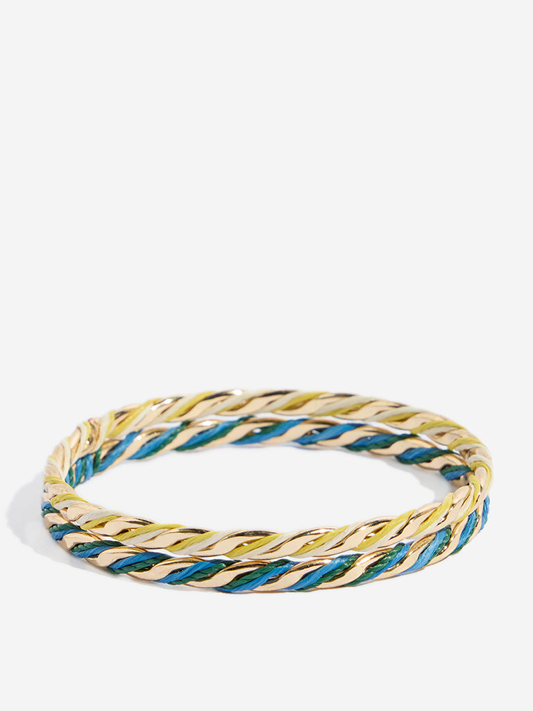 Add a vibrant twist to your accessories collection with this set of two thread work wrap bangle set from Westside Accessories. Designed with a gold-toned twisted base. one bangle is wrapped in bold blue and green threads. while the other pairs lime and white for a lively contrast. Eye-catching yet versatile. these bangles can be styled solo or stacked to bring a playful. handcrafted touch to everyday or festive looks.