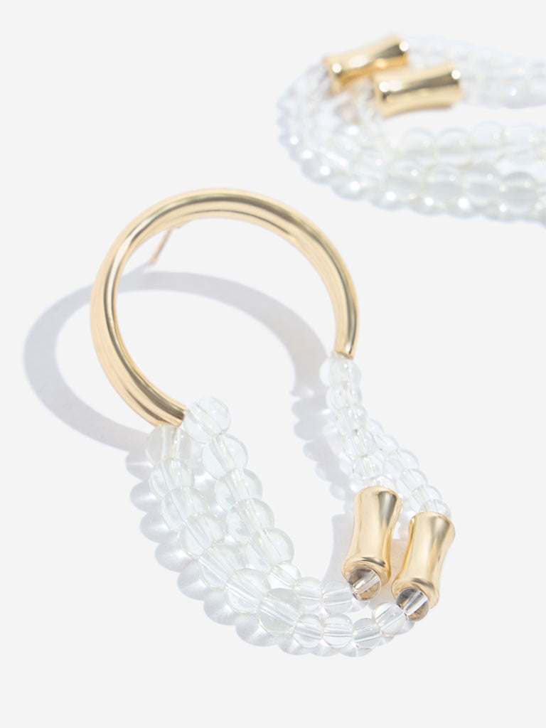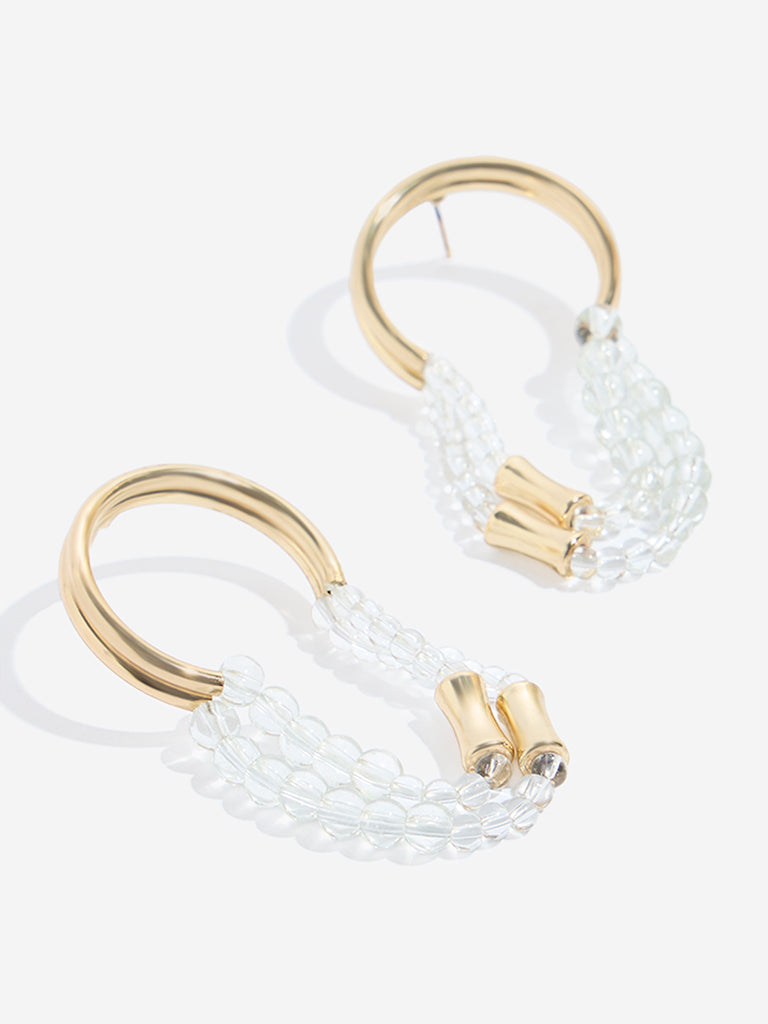 Westside Accessories introduces this standout pair of hoop earrings. defined by a distinctive C-shaped gold-toned design and clear bead accents. The polished arc is adorned with cascading clear spherical beads. highlighted by two gold-toned barrel beads for added charm. Finished with a post-back closure. this pair brings a confident and modern touch to your accessory line-up.