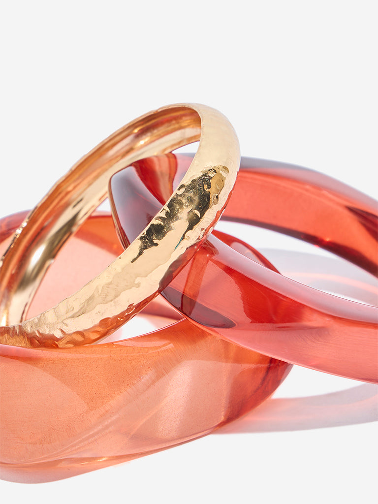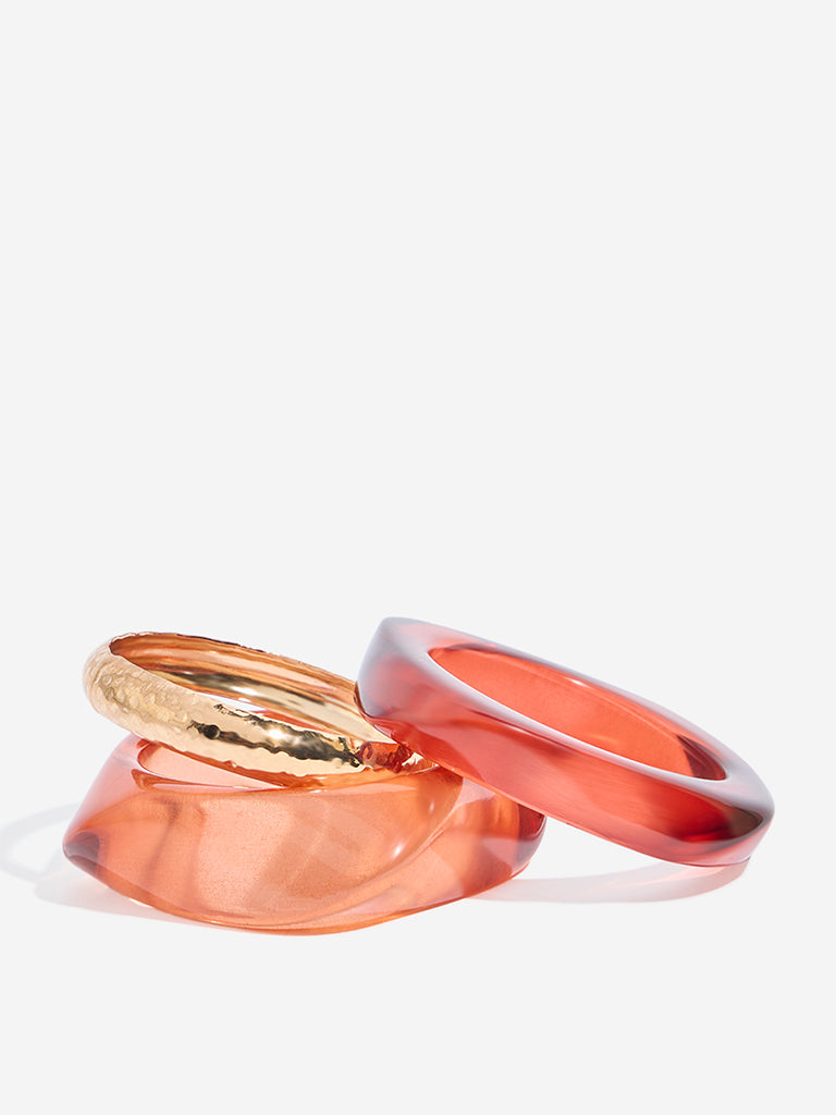 This bangle set from Westside Accessories features a striking blend of coral and gold tones with distinct silhouettes and textures. It includes a vibrant. translucent coral bangle with a wave-like form. a gold-toned piece with a refined hammered finish. and a deep coral bangle in a softly squared shape. Whether worn solo or stacked. these pieces lend a bold yet polished edge to contemporary accessorising.