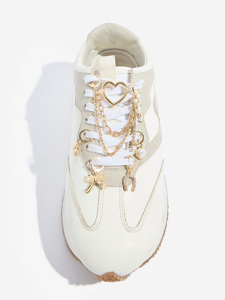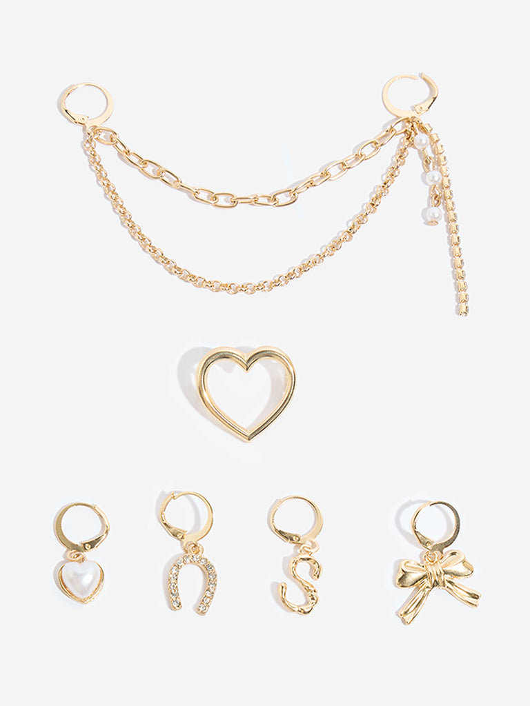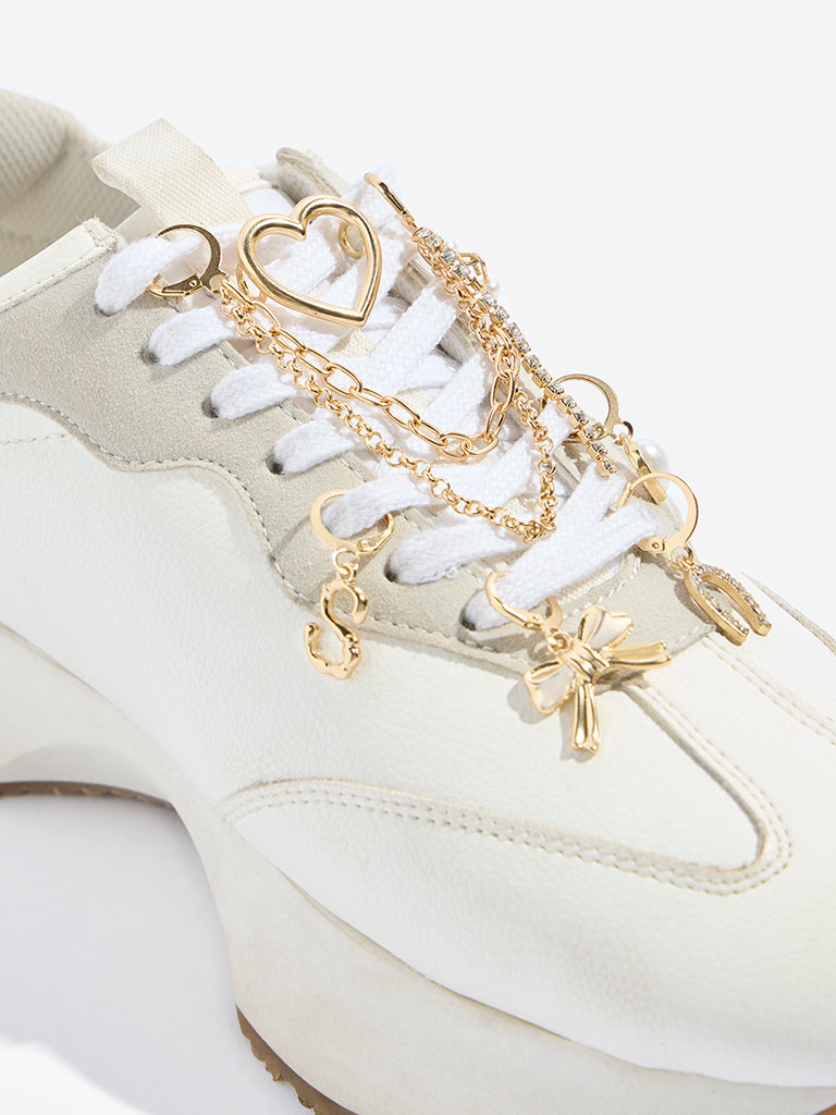 This multi shoe charms set from Westside Accessories brings a playful upgrade to your sneakers. It includes six thoughtfully designed charms??an open heart outline. a heart charm with a pearl-like bead. an embellished horseshoe. an ‘S’-shaped initial. and a petite bow. The set is finished with a dual-chain accent featuring classic gold-toned links paired with pearl-like beads and a slender dangling strand. Loop them through your shoelaces to create a personalised. standout finish with refined charm.
