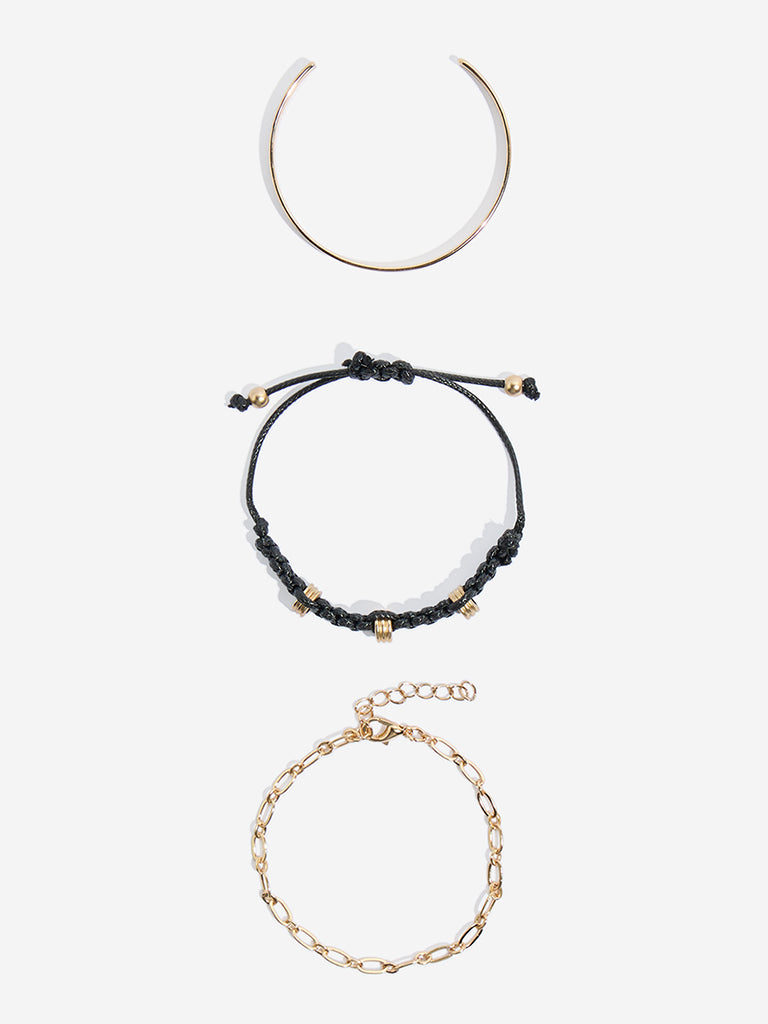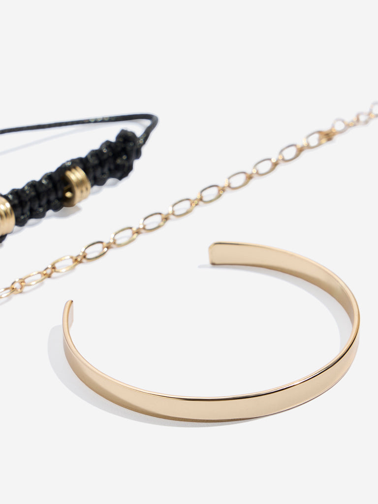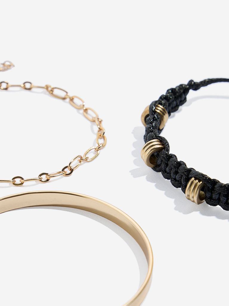 Westside Accessories curates this stacking bracelet set with a blend of structure and texture. The trio features a sculptural open cuff in a gold-toned finish. a black braided cord bracelet detailed with gold-toned beads and an adjustable tie closure and a fine paperclip chain for a sleek contrast. These versatile pieces offer endless styling options. whether worn individually or stacked for a more personalized look.