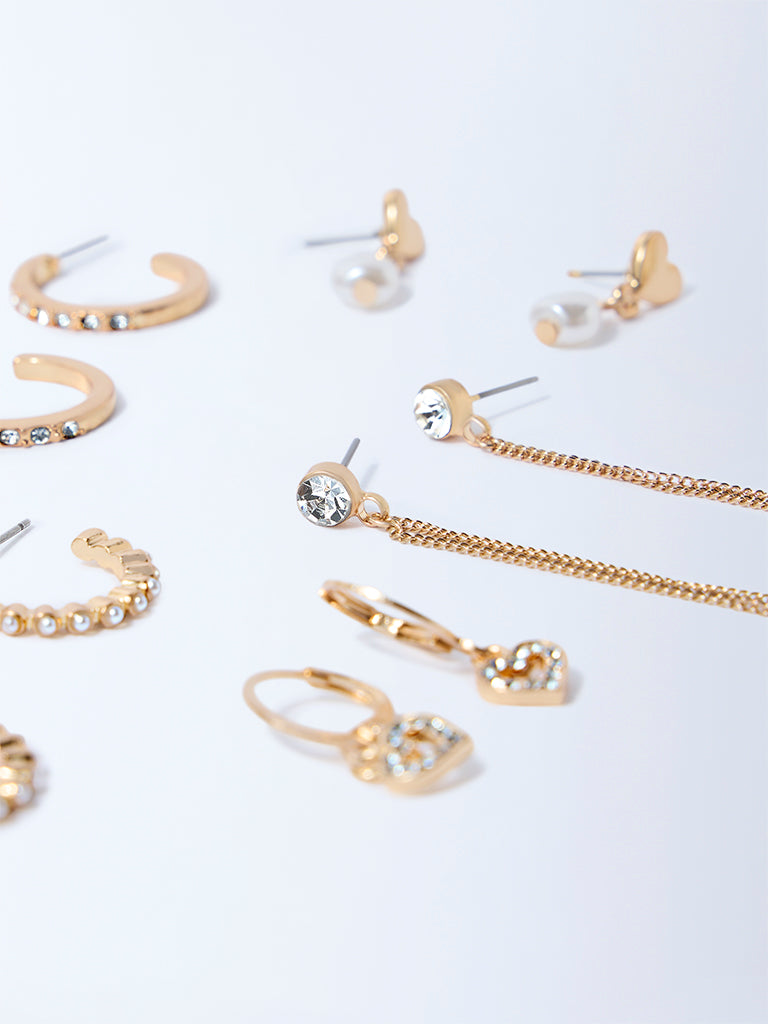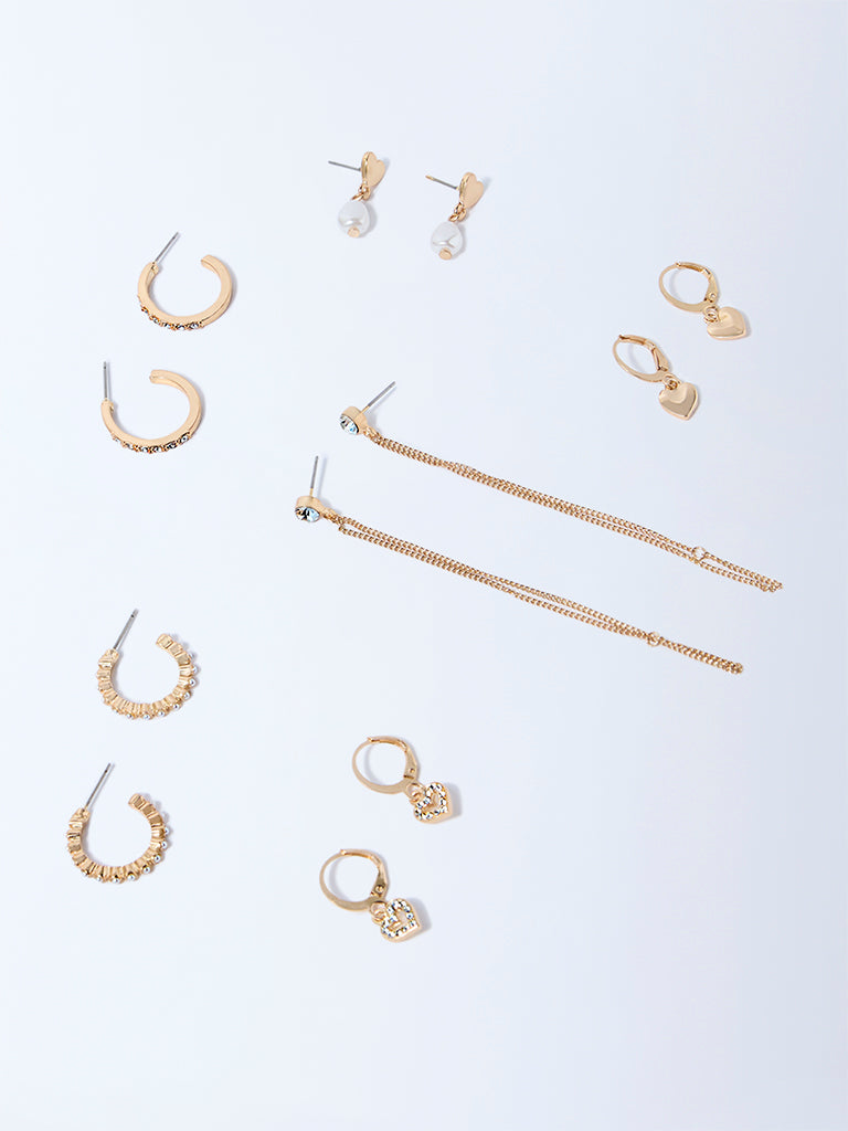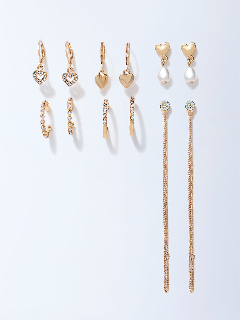 Westside Accessories curates a charming mix of earrings in this versatile set – perfect for adding personality to any look. From sleek hoops with openwork heart charms to polished pairs finished with glossy enamel and delicate pearls. each piece brings its own flair. Gold-toned textures. crystal-studded accents. and a touch of movement from chain danglers anchored by solitaire studs make this edit ideal for switching up your vibe. whether you’re going playful or polished. A must-have for effortless styling and layered ear candy moments.