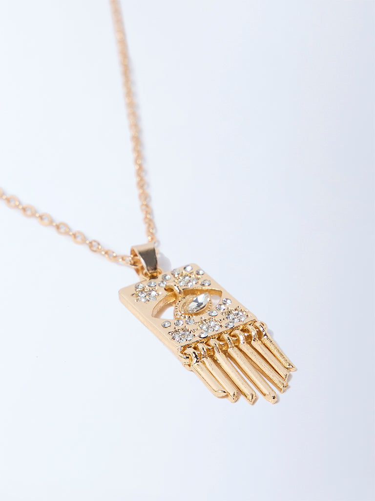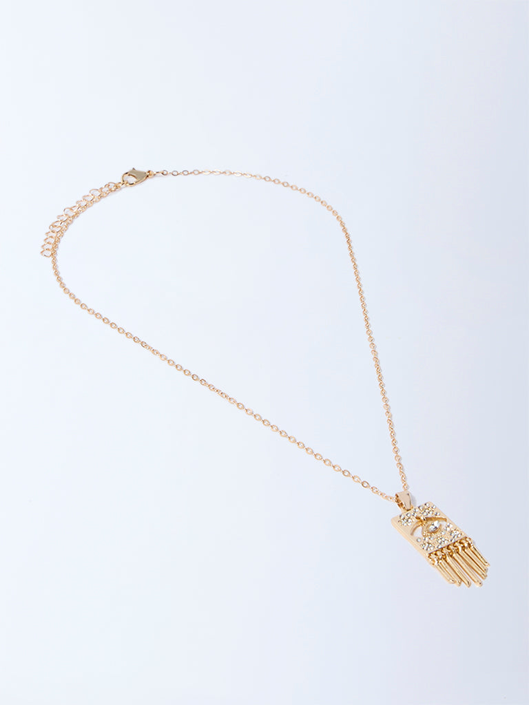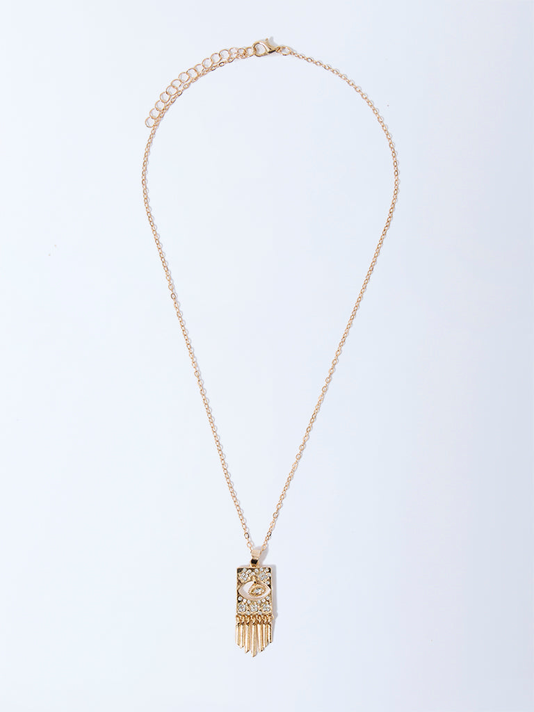 Enhance your style quotient with this gold necklace from Westside Accessories. Featuring a rectangular charm detailed with a stylised eye motif and surrounded by shimmering stones. it’s finished with a fringe of gold-toned bars for added texture and movement. Suspended from a fine chain and secured with a lobster clasp. this piece offers a modern accent to both casual and dressy looks.