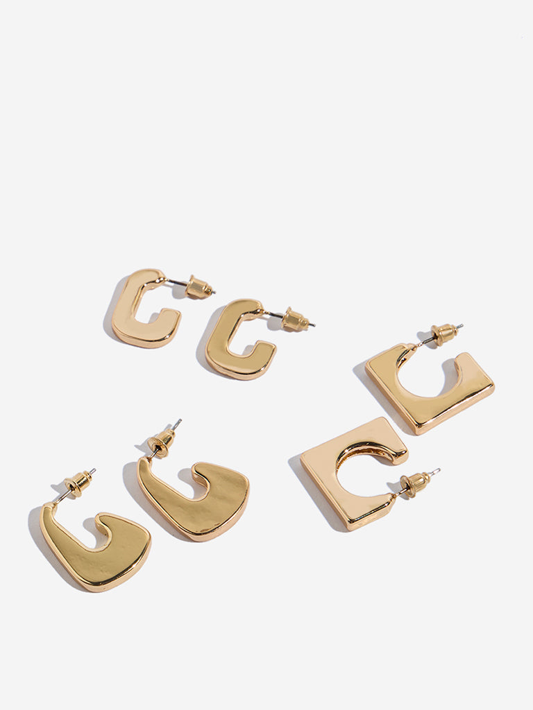 Westside Accessories launches this set of three flat earrings in sleek gold. These lightweight earrings are structured with varying geometric shapes that add an element of spunk with class.