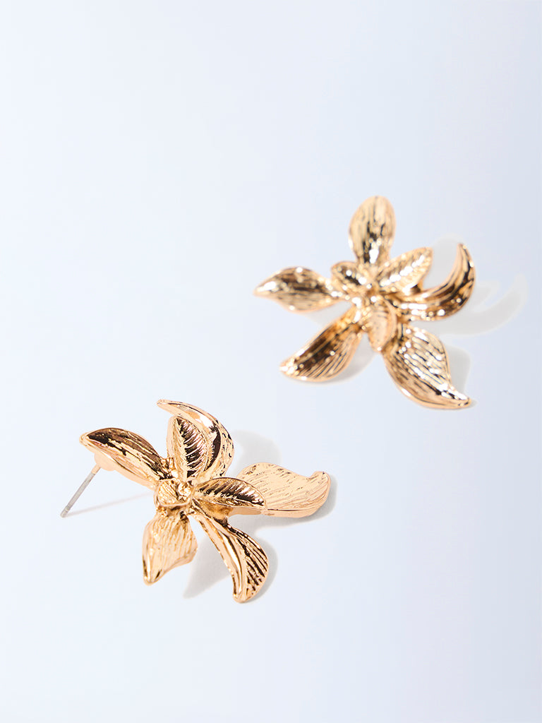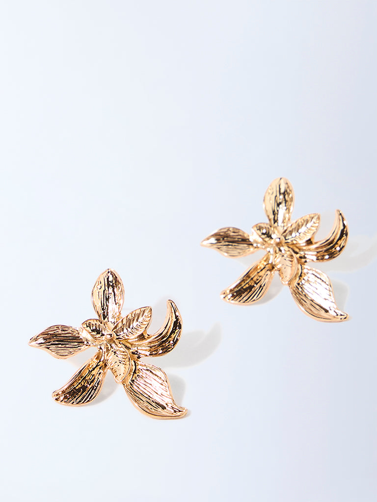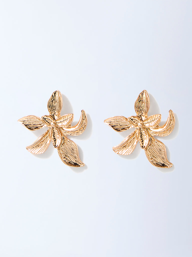 These gold-toned stud earrings from Westside Accessories exude feminine elegance with a delicate. tropical charm. Crafted in a sculptural floral motif with a subtle metallic finish. they feature secure post-back fastening for a comfortable. effortlessly beautiful finish.