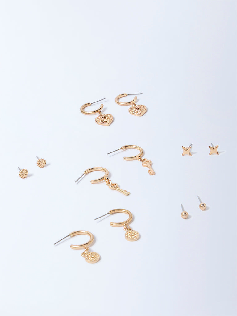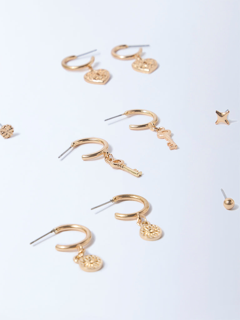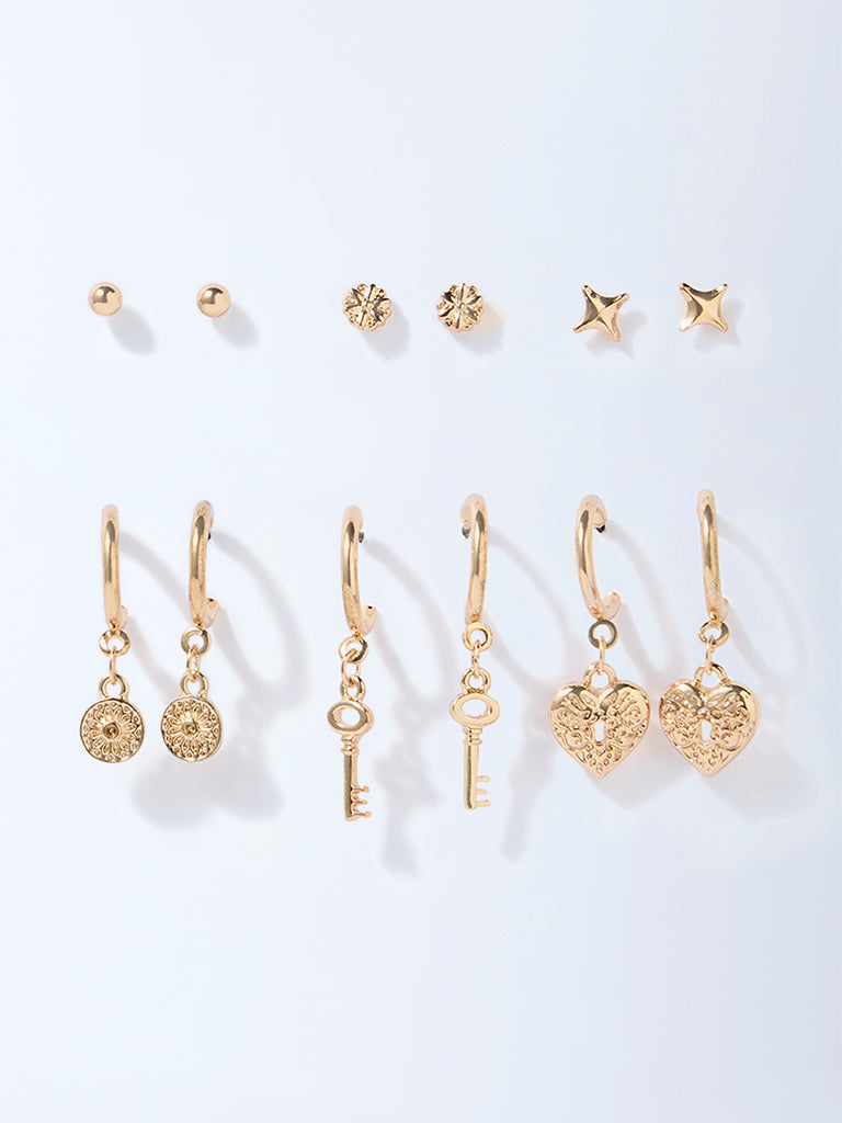 Striking the perfect balance between whimsy and refinement. this six-pair earring set from Westside Accessories is made for modern layering. The top row features three sculptural studs – metallic starbursts. delicate florals. and sleek domes??ideal for subtle styling or stacked combinations. The bottom row introduces charm-forward mini hoops that bring personality to any look: a sculpted heart. a textured floral medallion. and a vintage-inspired key. all finished in high-gloss gold.