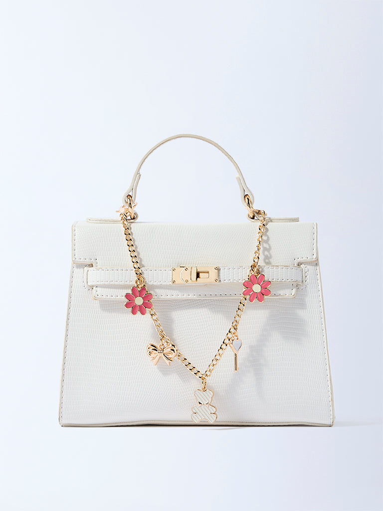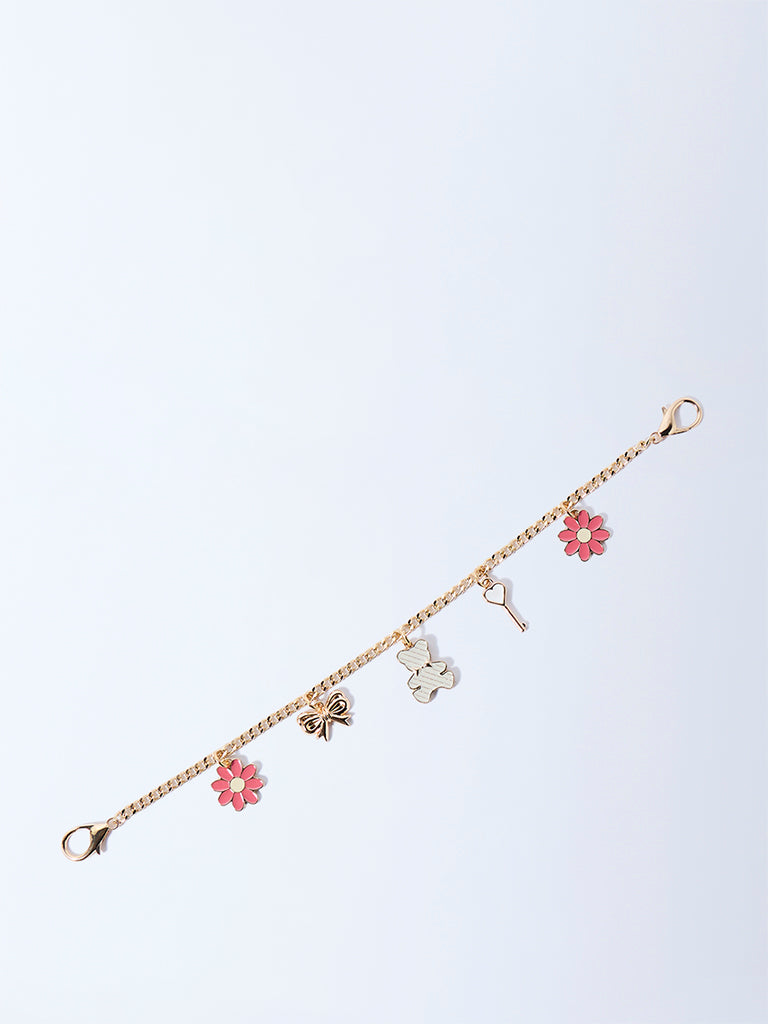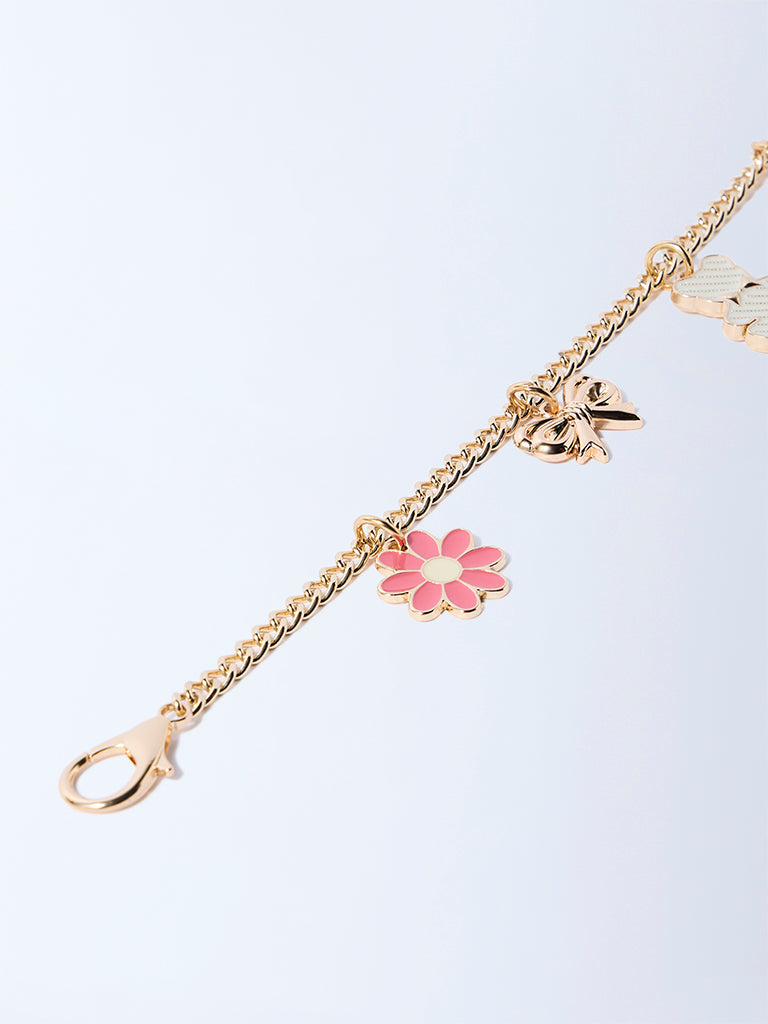 Personalize your carryall with this gold bag charm from Westside Accessories. This slender chain presents a playful collection of charms: two bright coral-pink enamel flowers. a miniature striped teddy bear. a delicate bow. and a tiny heart-topped key. The inner structure of the chain ensures each charm hangs distinctively. It fastens easily with a lobster clasp at both ends. offering versatile attachment to bags. zippers. or even as a decorative bracelet.