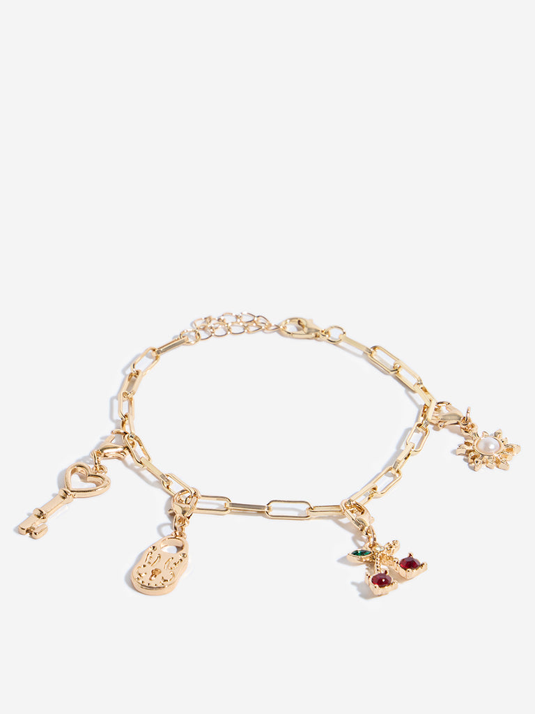 Westside Accessories offers this charming bracelet set. featuring two gold-toned designs crafted with delicate detailing. The first bracelet showcases a simple fine chain for a classic touch. The second bracelet features elongated links adorned with six distinctive charms??a heart-shaped key. crystal-embellished cherries. a textured padlock. a dark stone-paved heart. a silver-toned star outline. and a pearl-encrusted motif. Completed with a lobster clasp and adjustable chain. this duo brings a thoughtful layer of personality and polish to your accessory collection.