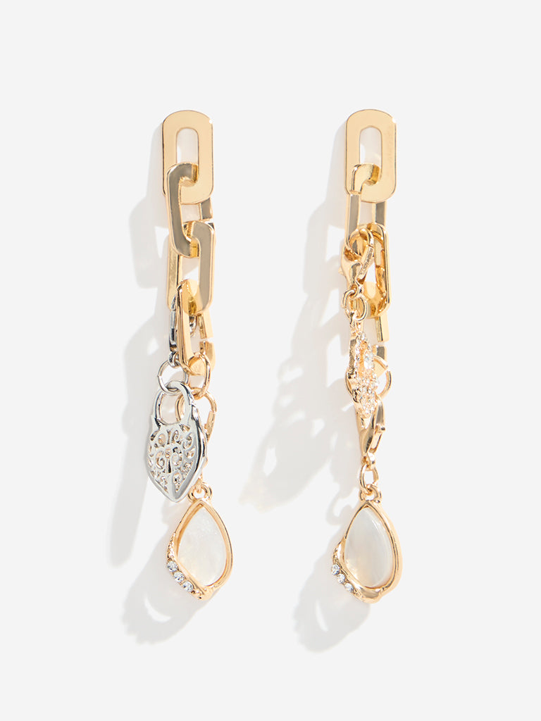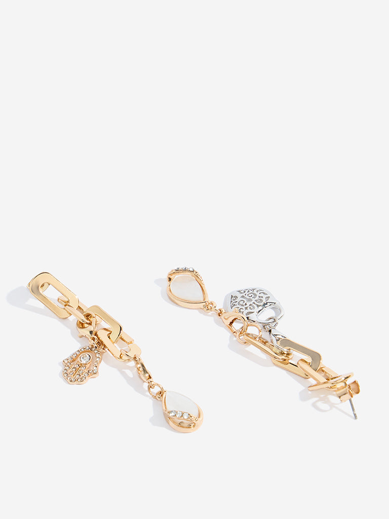 This pair of dangler earrings from Westside Accessories features an elegant gold-toned elongated link chain that gracefully suspends a mix of charms. Textured gold-toned elements. crystal accents. and a teardrop-shaped charm at the base create a layered effect. Finished with a secure post backing. this design adds refined movement and contemporary charm to any look.