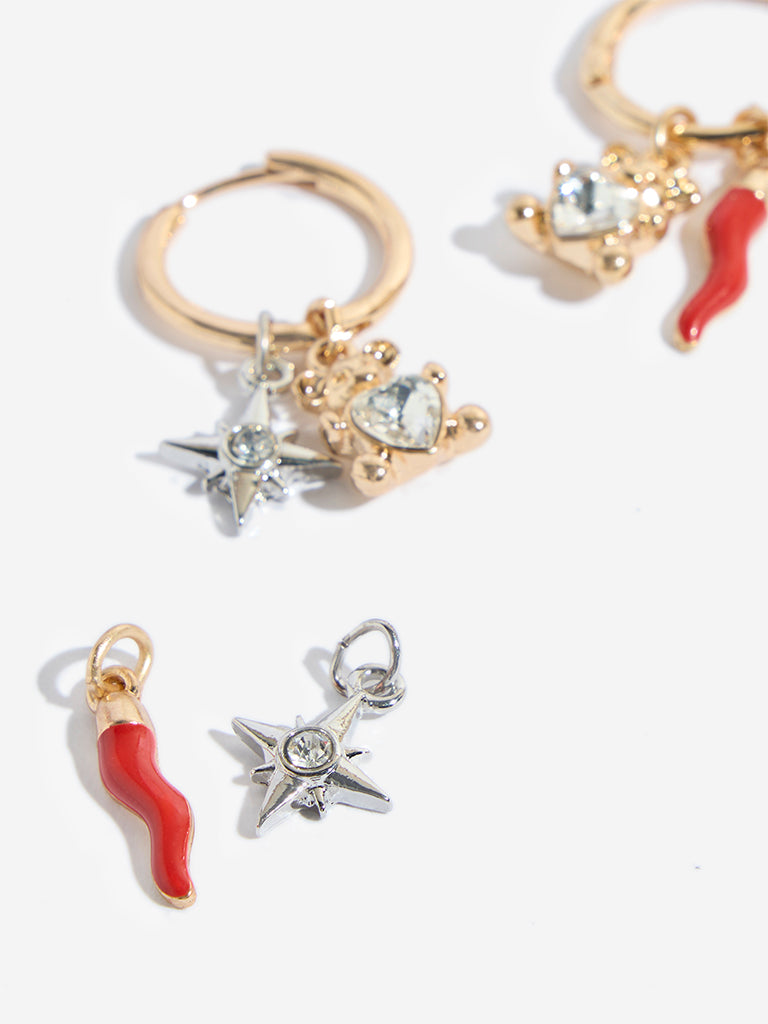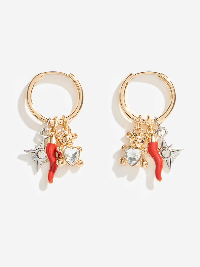 Westside Accessories presents these gold-toned hoop earrings. designed in a classic circular silhouette with a secure hinged closure. Each hoop is adorned with a lively cluster of charms. including a bold red chilli pepper. shimmering crystal-like accents. and gold-toned star motifs. The striking blend of vivid colour and sparkle infuses the design with a spirited. contemporary flair.
