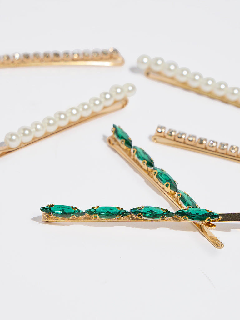 Westside Accessories launches this gold hair clip set featuring three elegant pairs. each uniquely designed with clear rhinestones. green stones. and pearls. Lightweight and easy to use. these clips are perfect for effortlessly elevating your everyday or party looks.