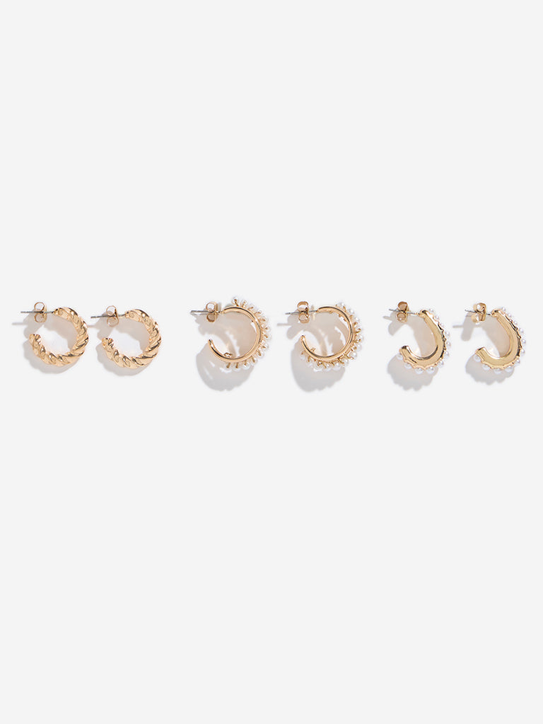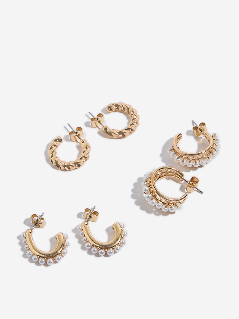 These gold hoop earrings from Westside Accessories are presented in a set of three with stunning designs. Available in small sizes. it features pair of two earrings with pearlescent and twisted build. The third pair depicts a mix of both these designs. Lightweight and elegant. the set is perfect for everyday wear.