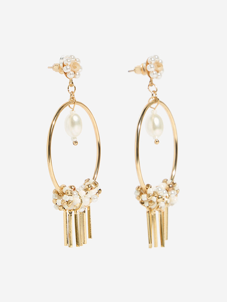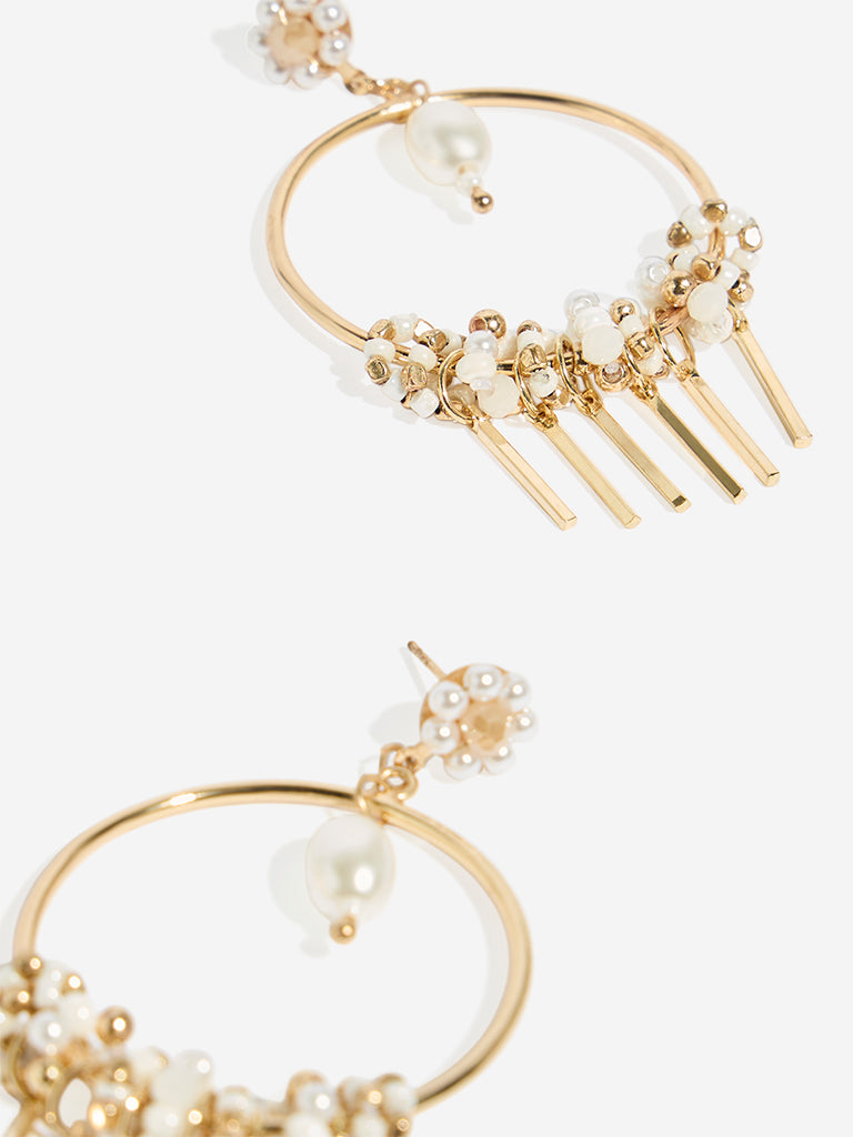 Westside Accessories presents these dangler earrings to redefine statement accessorising. The design begins with a pearl-studded stud that suspends a single teardrop pearl. lending a soft. graceful accent. Gold-toned hoops are adorned along the lower arc with clusters of white beads and faceted gold square elements. while fine metal line drops add gentle movement and texture.