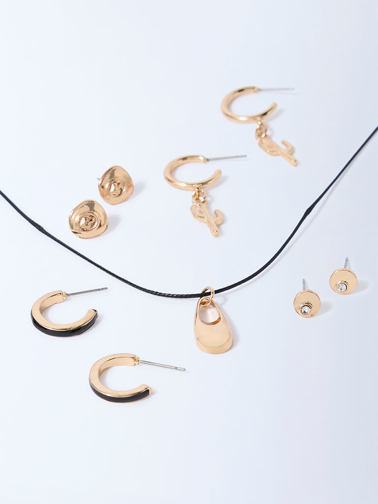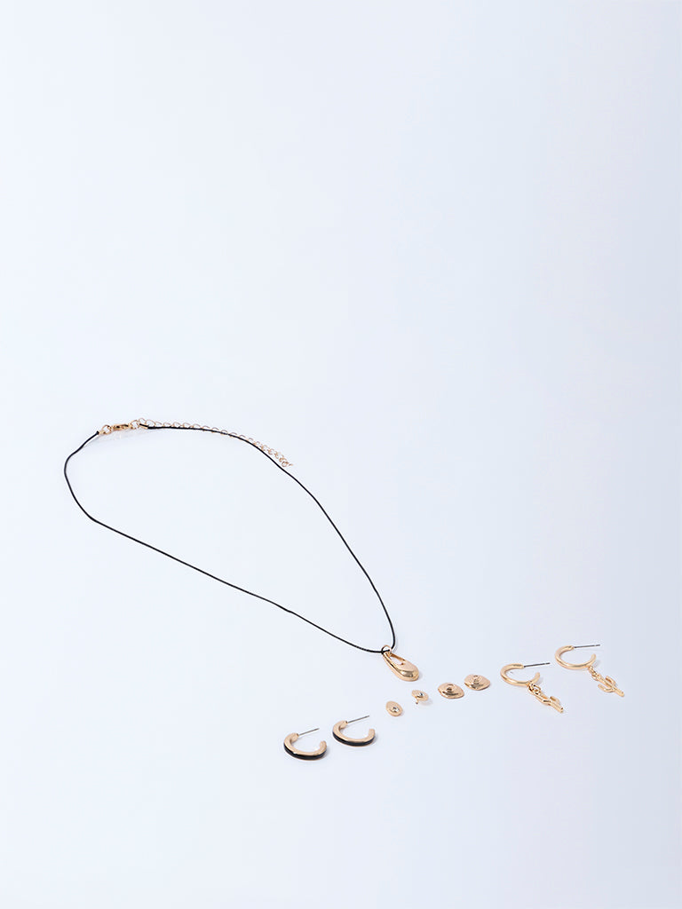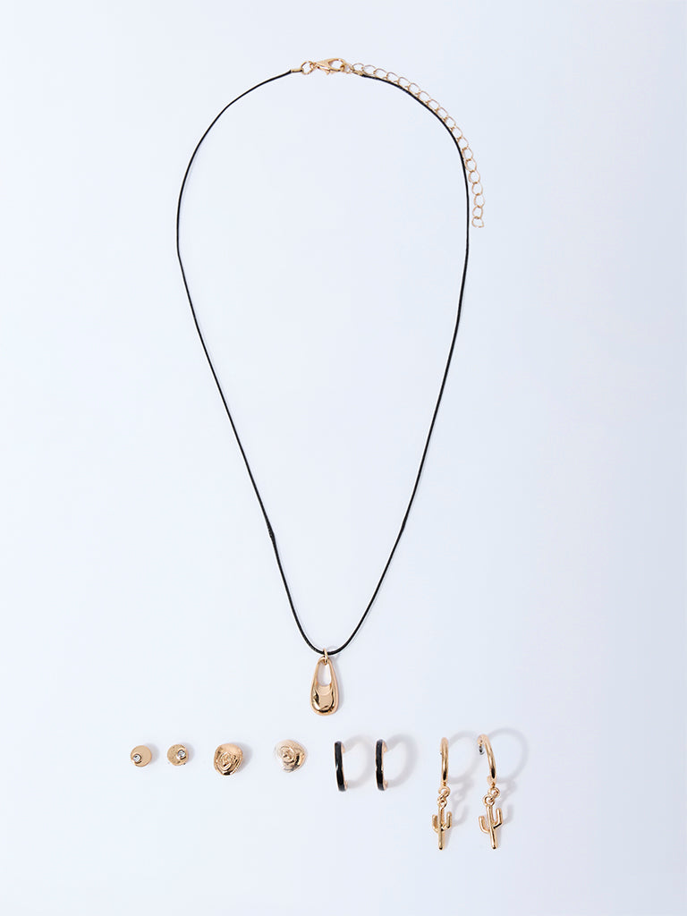 Modern and minimal. this gold pendant necklace and earrings set from Westside Accessories will elevate your style quotient. The necklace pairs a sleek black cord with a teardrop-shaped gold-toned pendant. striking the perfect balance between bold and refined. The accompanying earrings offer a playful mix – think classic hoops. dainty gold studs. engraved coin details. and quirky charm drops.