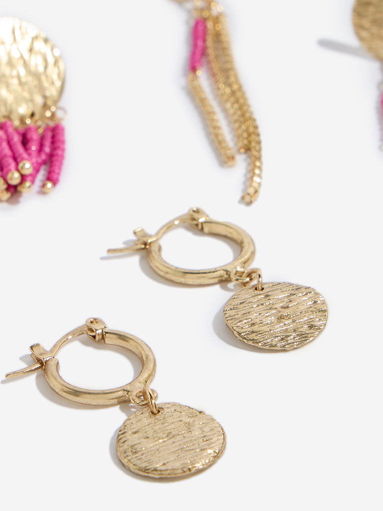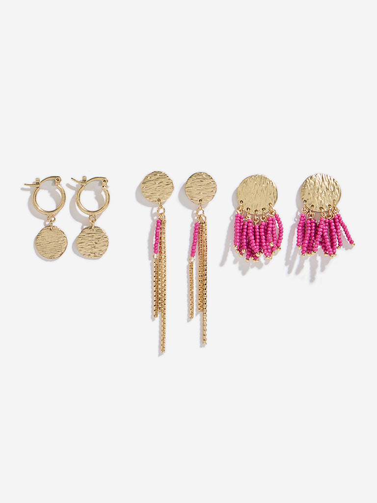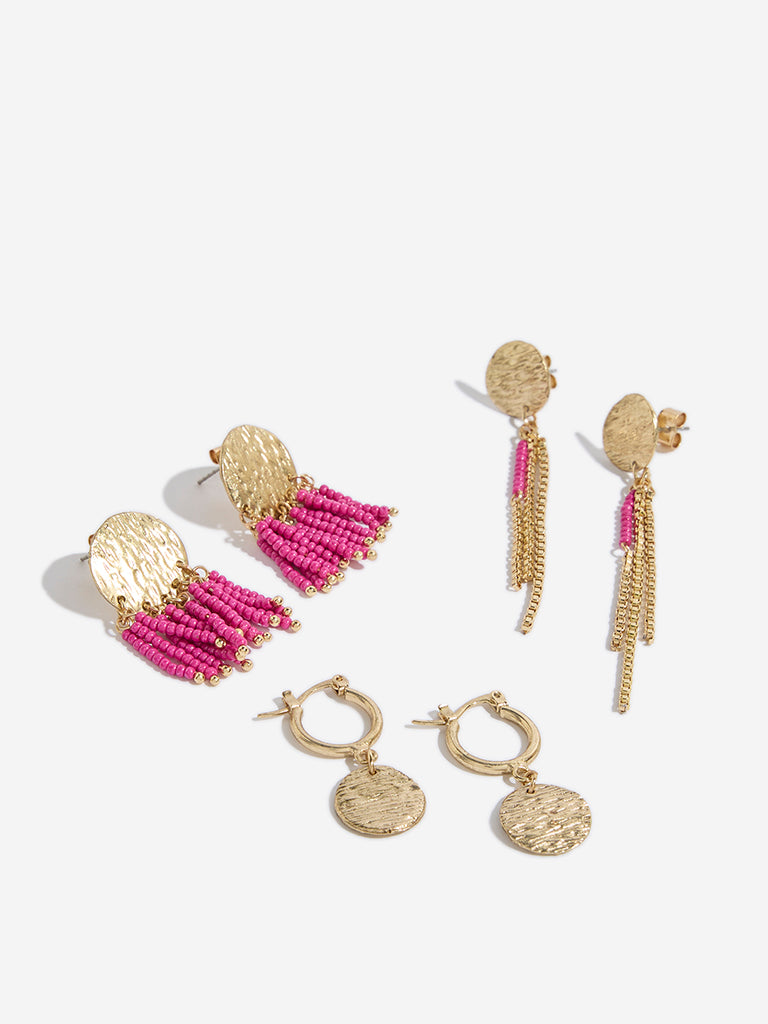 Westside Accessories presents this earrings set. offering three unique styles. including a tassel drop earrings featuring gold discs with cascading pink beaded fringe. chain drop earrings with a gold disc and a subtle pink thread detail and a classic gold hoops adorned with textured disc charms. Designed with snap closures. this trio brings a vibrant touch to any ensemble.