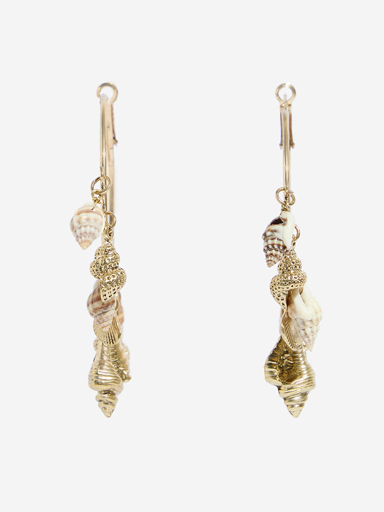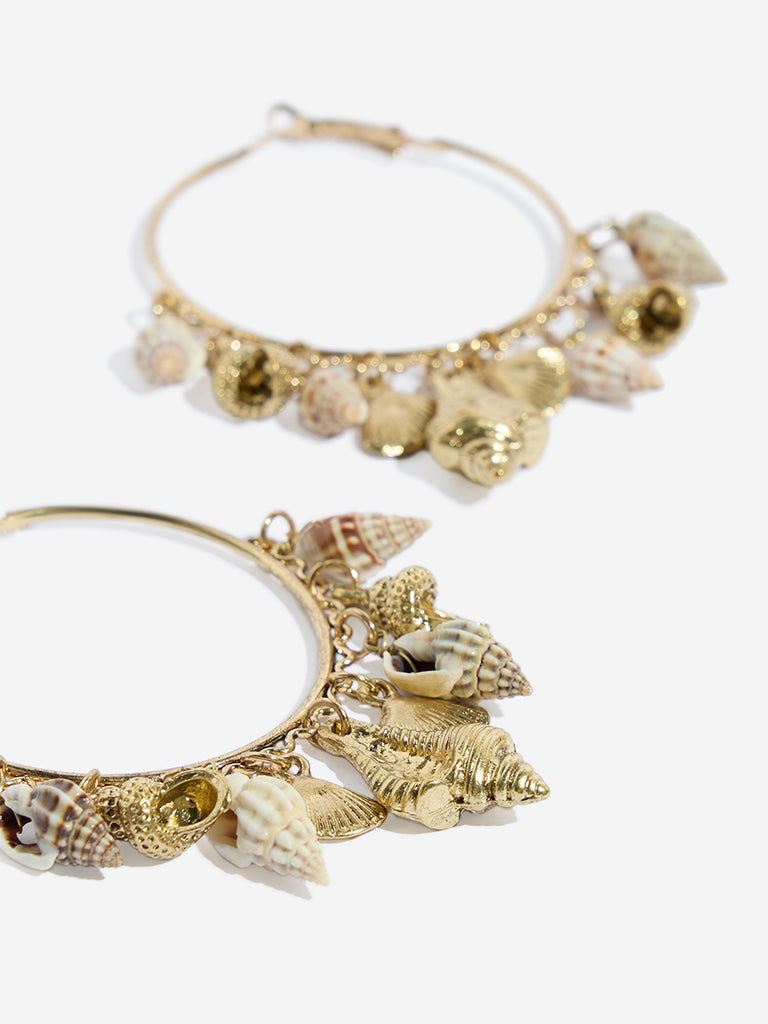 This distinctive pair of gold shell hoop earrings from Westside Accessories blends natural textures with polished detailing. The slim gold-toned hoops are embellished with miniature shells in varied shapes and tones. interspersed with subtly hammered metallic charms for added dimension. Striking a balance between effortless style and contemporary appeal. these earrings are perfect for elevating everyday looks with a hint of character.