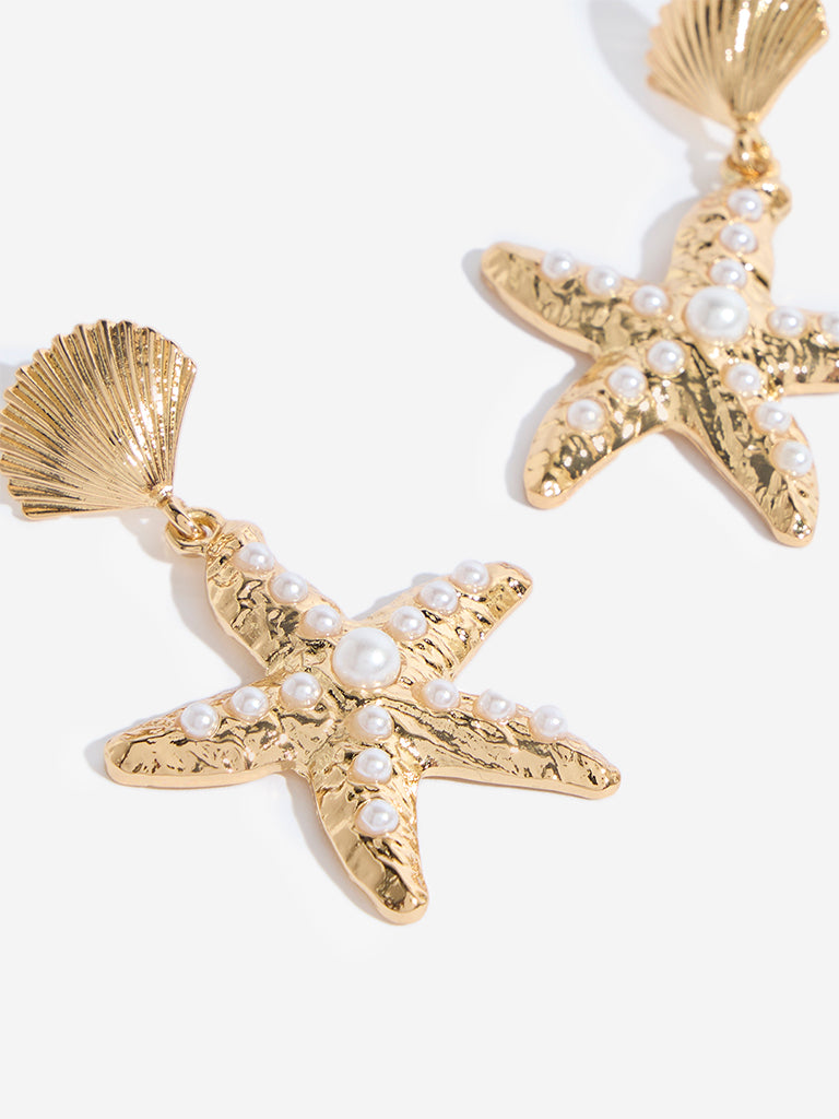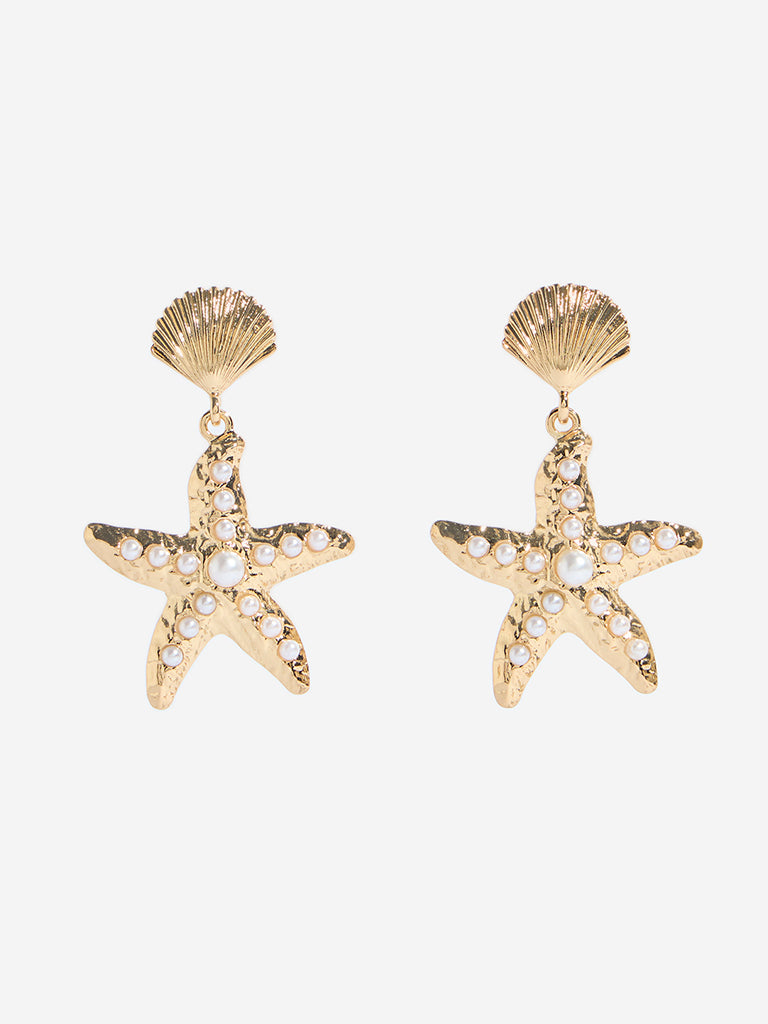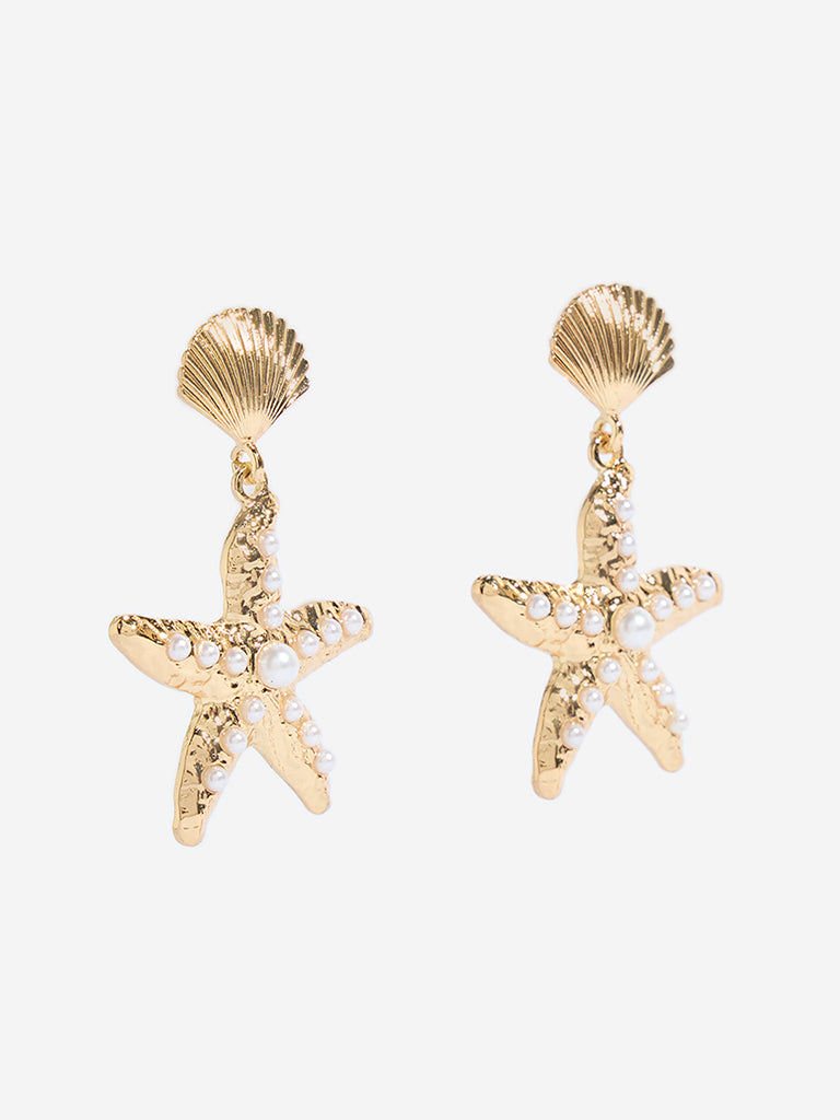 These gold-toned earrings from Westside Accessories feature a seashell stud and a dangling starfish charm. The starfish is detailed with tiny pearl-like accents for added texture. while the post backing ensures a secure fit. making them a charming addition to your accessory collection.