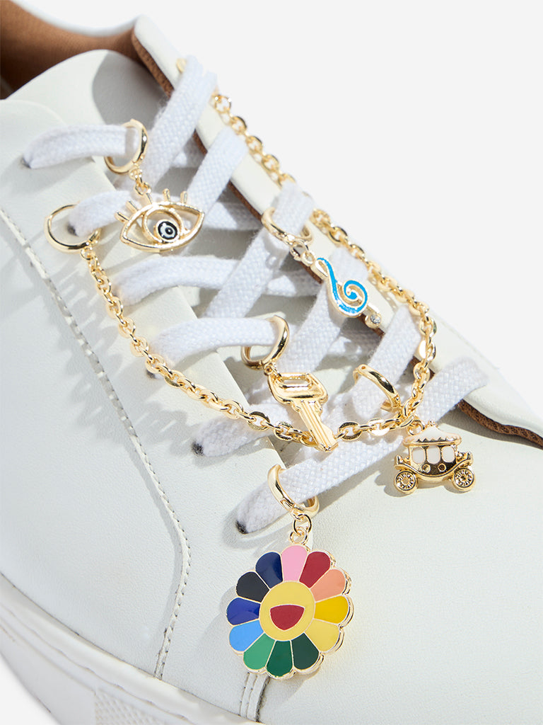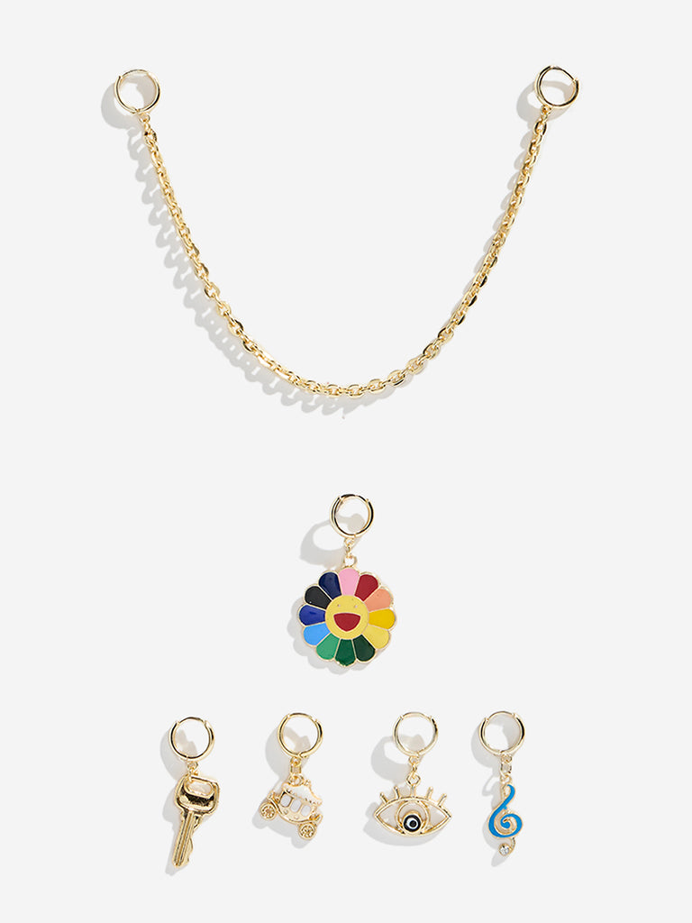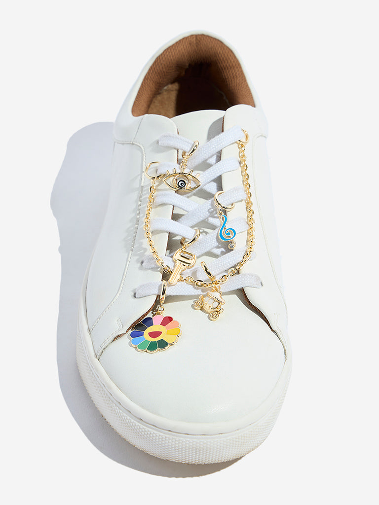 Westside Accessories introduces this charm set featuring six intricately designed gold-tone pendants. The collection includes an interlinked chain. a multicolour smiley flower. a carriage design. a musical chord. a textured key and an evil eye. Fitted with hinged hoop clasps for easy attachment. these charms can be styled on shoes. bracelets and necklaces. offering a personalized touch to any jewellery collection.