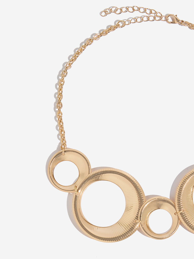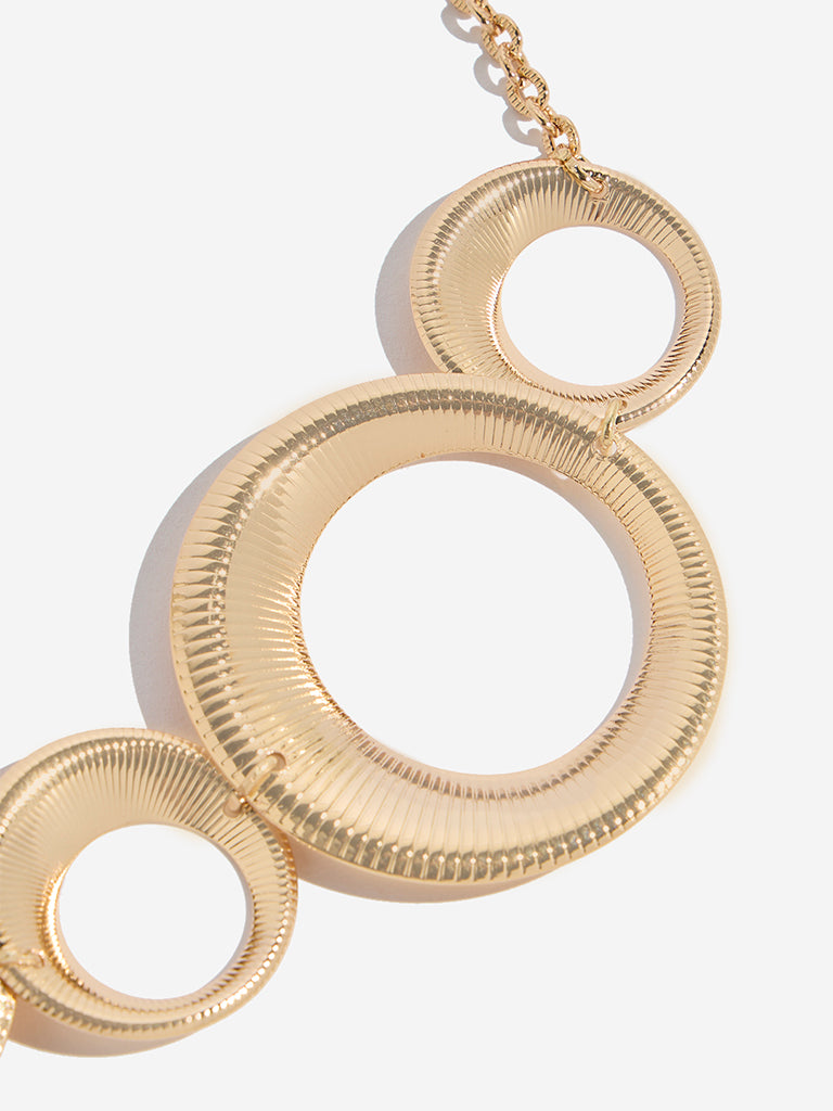 This statement necklace from Westside Accessories showcases a series of interconnected gold-tone rings in varying sizes. each accented with subtle ribbed detailing for added texture. The adjustable extension chain and lobster clasp ensure a customized fit. making this a standout accessory to complement both everyday and occasion wear.