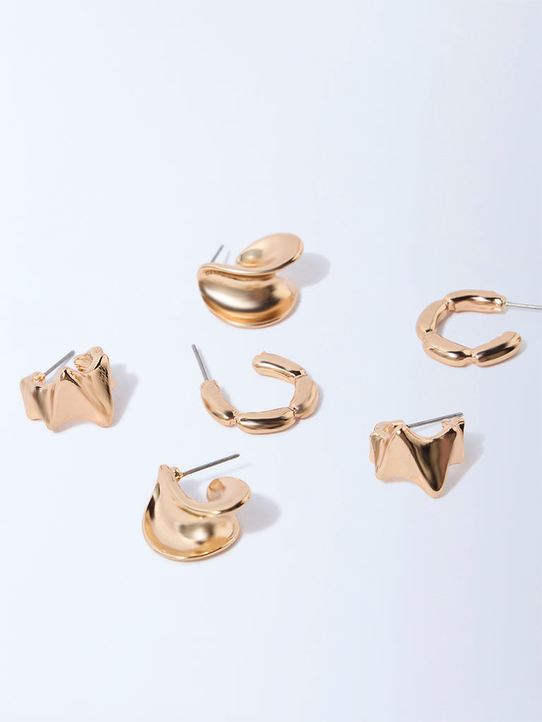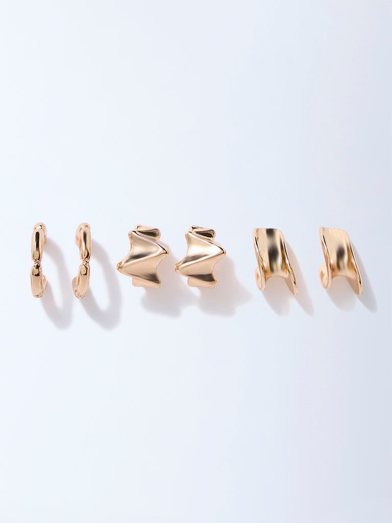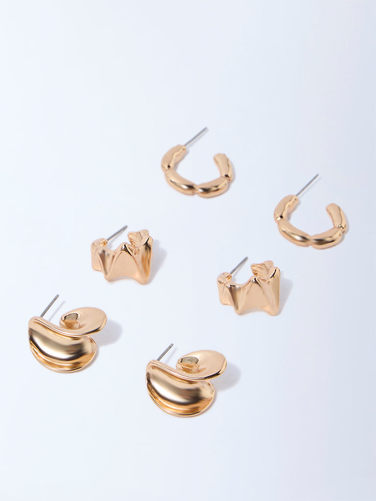 Refresh your essentials with this three-piece earring set from Westside Accessories. The collection features a mix of slim polished hoops. bold sculptural forms. and chunky textured designs in a radiant gold finish. Versatile and modern. these earrings are perfect for pairing with both casual edits and elevated looks.