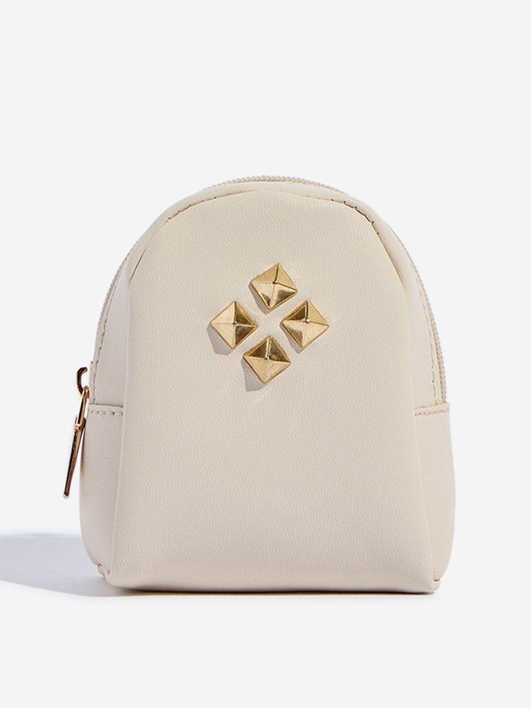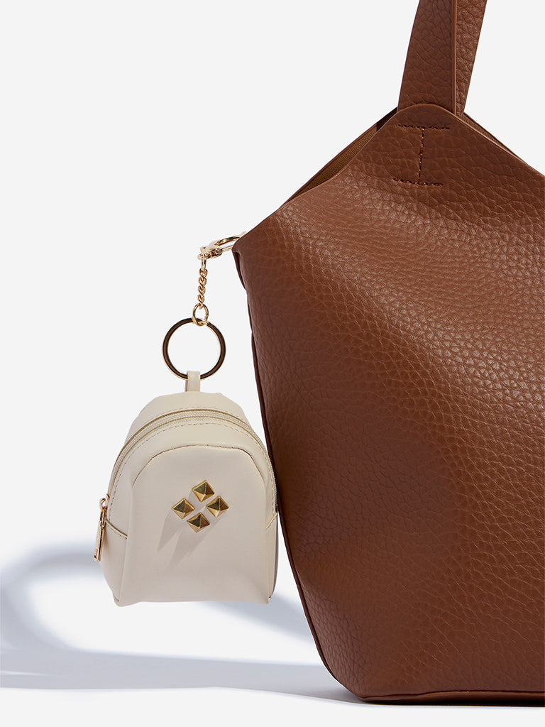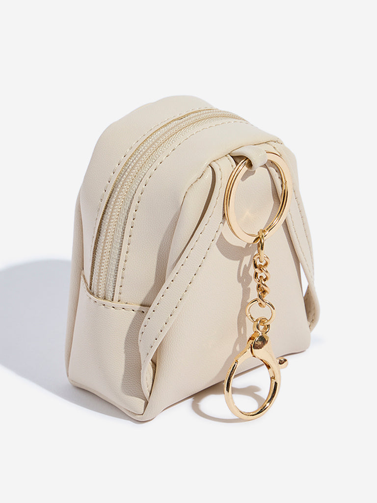 This ivory bag charm from Westside Accessories captures the essence of a classic backpack in miniature form. With a functional gold-toned zipper and subtle pyramid stud detailing. it offers a distinctive touch to your bag. Completed with a gold-toned ring and secure lobster clasp. this charm is the perfect way to add a personal. elevated detail to your accessories.