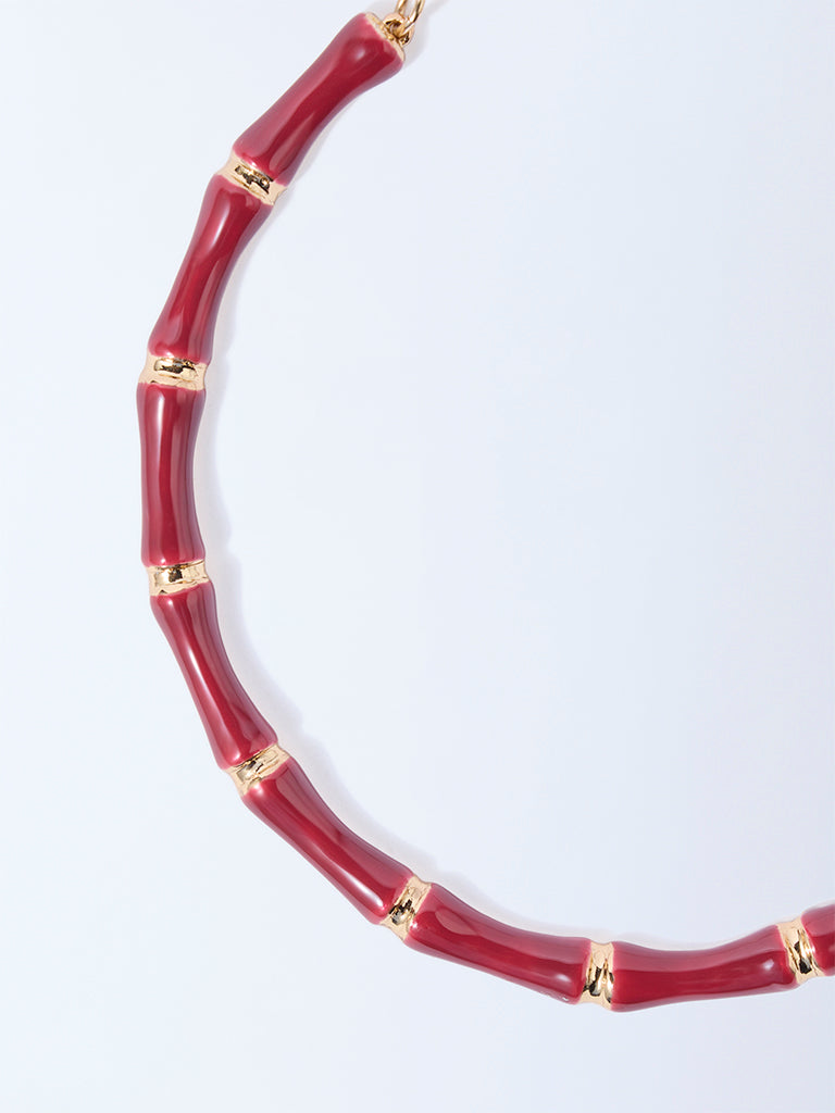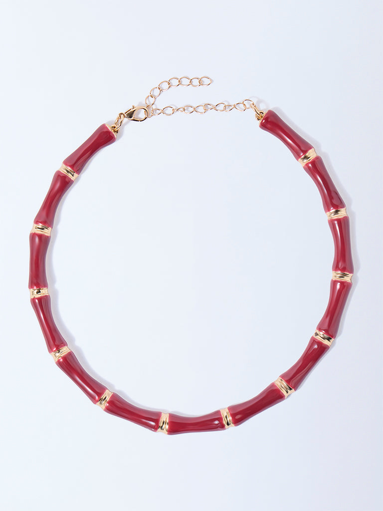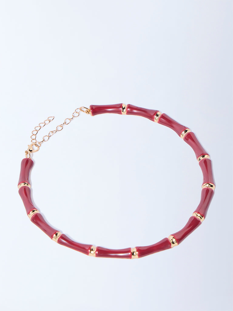 Channel modern sophistication into your off-duty style with this maroon enamel statement choker from Westside Accessories. Defined by its bamboo-inspired silhouette and high-gloss finish. it delivers a bold sculptural edge to any look. Finished with an adjustable chain for a secure fit. it transitions seamlessly from polished daywear to striking evening ensembles.