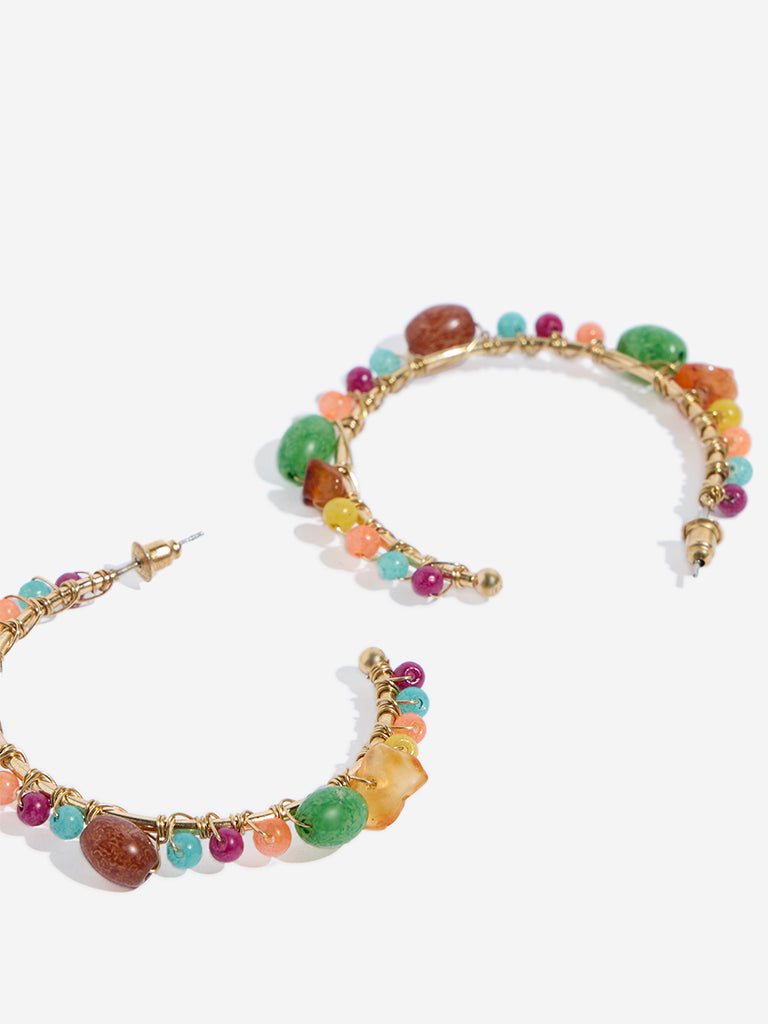 Westside Accessories presents these vibrant multicolour beaded half hoop earrings. designed to bring a playful yet polished touch to your look. Each gold-toned half hoop is intricately adorned with small round beads in shades of pink. yellow. and turquoise. interspersed with larger. irregularly shaped stones in earthy tones of green. orange. and brown. The lively mix of textures and colours creates a distinctive. eye-catching design??perfect for adding a pop of fun to any outfit.