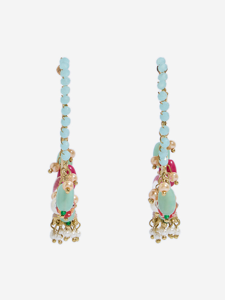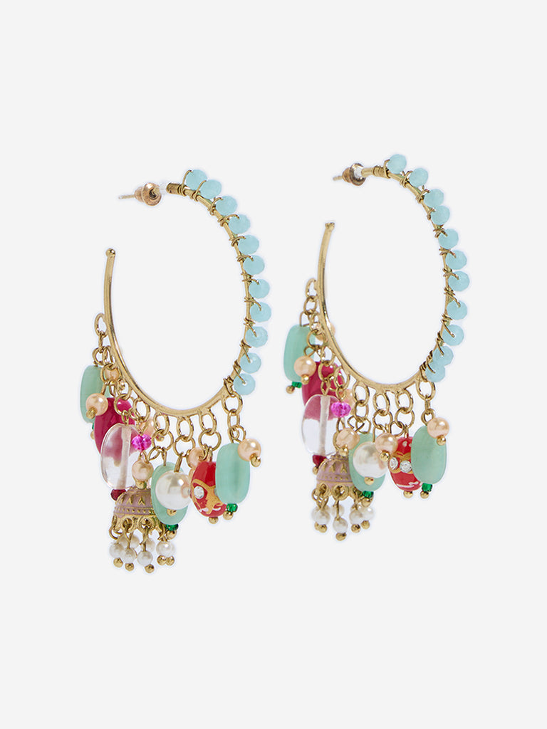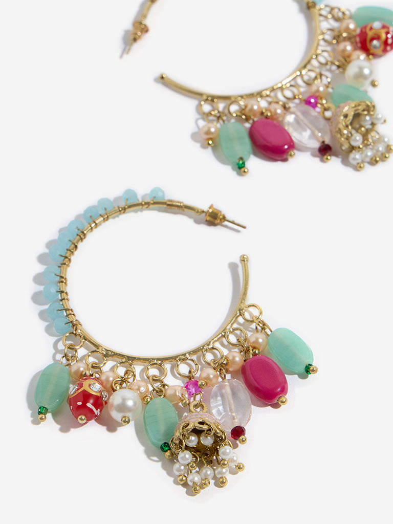 Westside Accessories presents these vibrant gold-tone half hoop earrings featuring delicate blue beads along the rim. Cascading below are an eclectic mix of multicolored beads. faux pearls. and miniature jhumka charms. adding movement and charm. Ideal for festive occasions and statement styling. these earrings bring a lively. artistic touch to any ensemble.